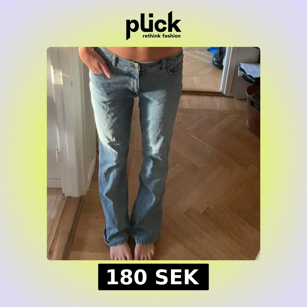 Säljer ett par ljusblå bootcut jeans med snygg detalj på bakfickan. Låga i midjanMärke Lindex men köpt på vintage butik. Skulle säga att de passar storlek S, men också mindre och större beroende på önskad passform.