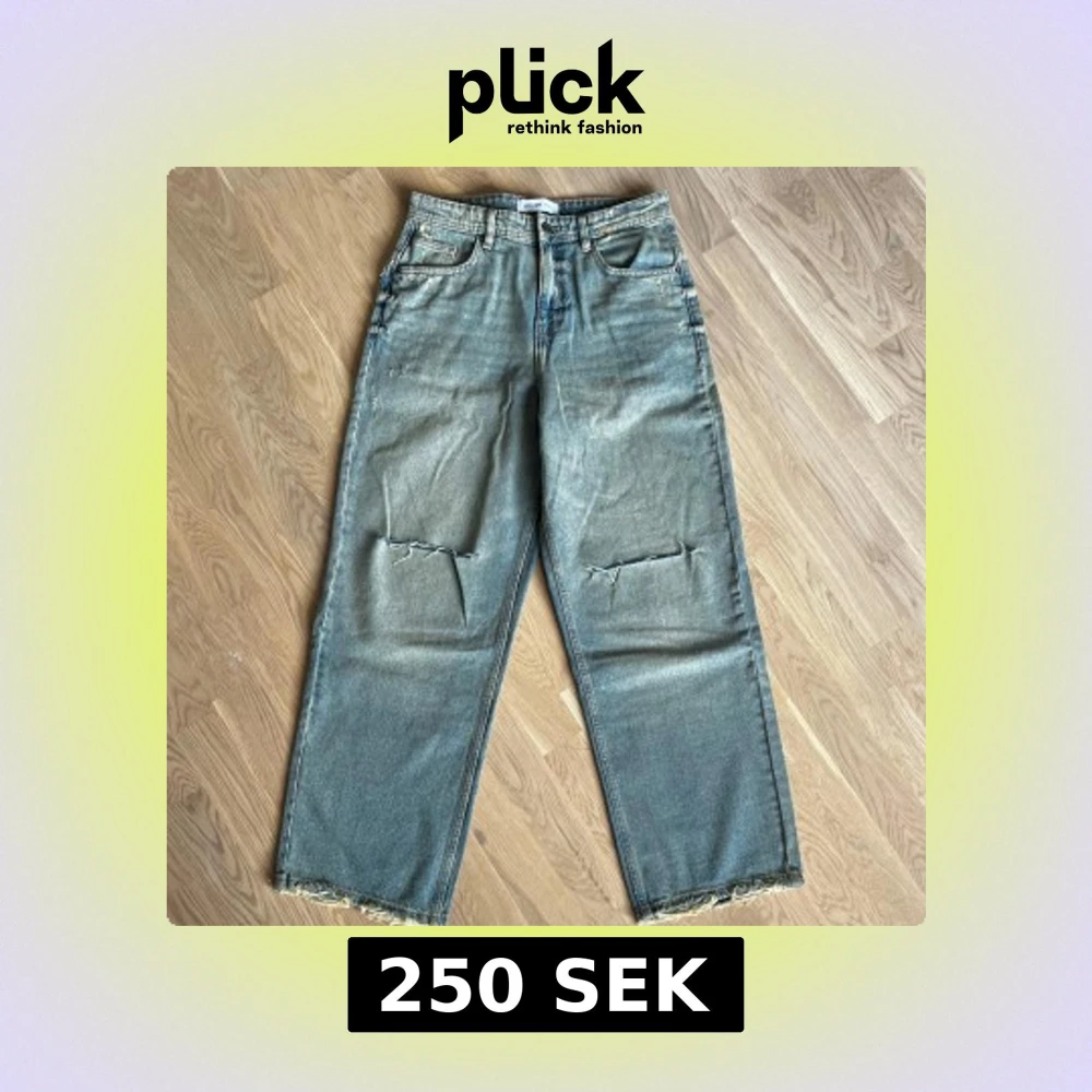 Säljer ett par blå jeans från House i storlek S. Jeansen har wide fit, hög midja och slitna detaljer vid knäna samt råa kanter nertill. Klassisk femficksmodell i denim med snyggt tvättad look. Aldrig använda.