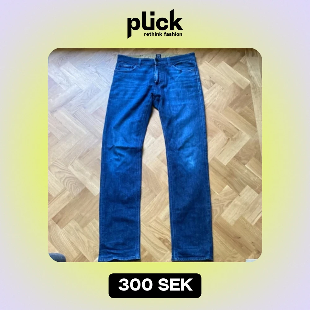 Säljer ett par snygga blå jeans från Hugo Boss. De är i bra skick och har en klassisk femficksdesign. Jeansen har en normal passform och är tillverkade i ett hållbart material. Perfekta för både vardag och fest! jeansen storlek är 34/34 men passar bra på mig som är 181 och väger 75kg