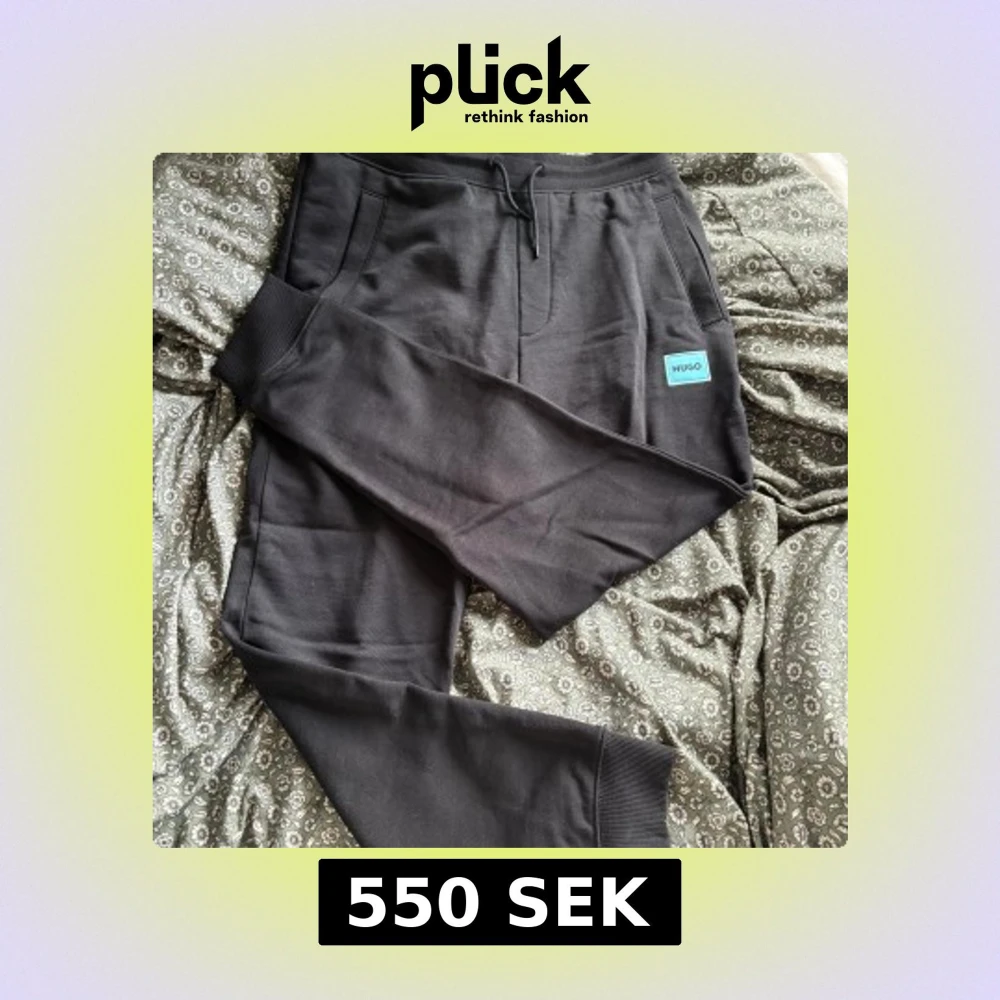 Svarta mjukisbyxor från Hugo med ribbade muddar, snörning i midjan och en blå Hugo-logga på vänster ben. Byxorna har en relaxed fit och är tillverkade i mjuk bomull för maximal komfort. Perfekta för chill dagar eller när du vill ha en clean streetstyle.T shirt är med också.