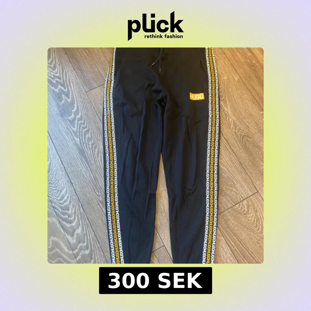 Svarta mjukisbyxor från Hugo Boss med gula och vita loggor längs sidorna och en gul HUGO-logga på låret. Byxorna har dragsko i midjan och är i en slim passform. Perfekta för en chill och sportig look.