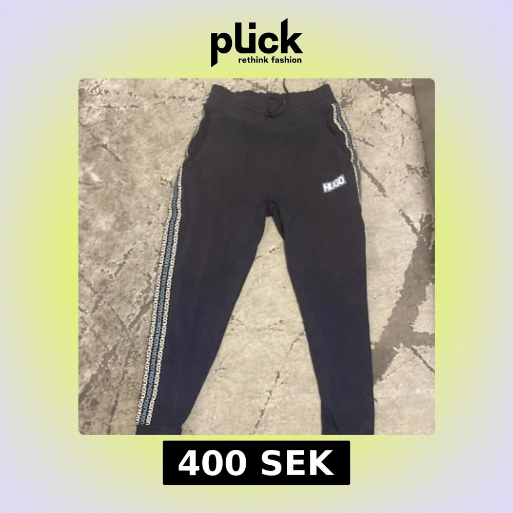 Svarta mjukisbyxor från Hugo Boss med vit HUGO-logga på vänster lår och logoband längs båda sidorna. Byxorna har snörning i midjan och är tillverkade i mjukt bomullsmaterial. Perfekta för chill eller träning.