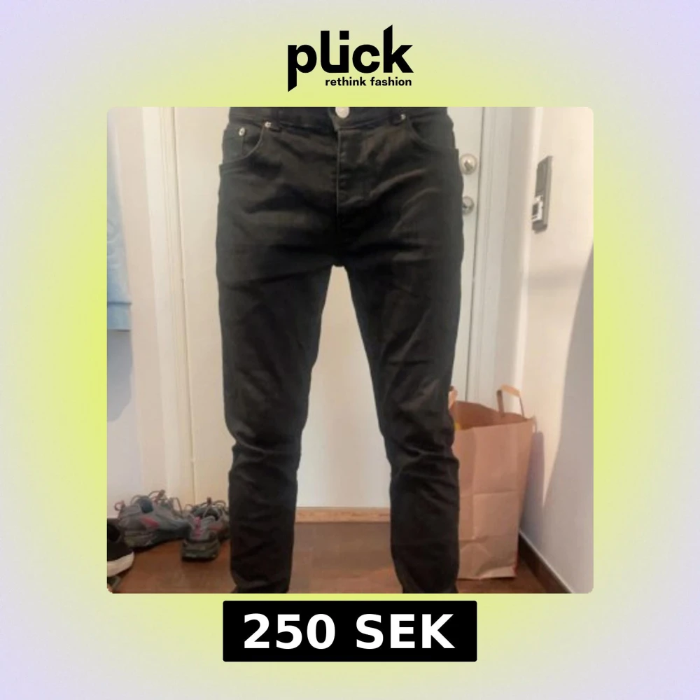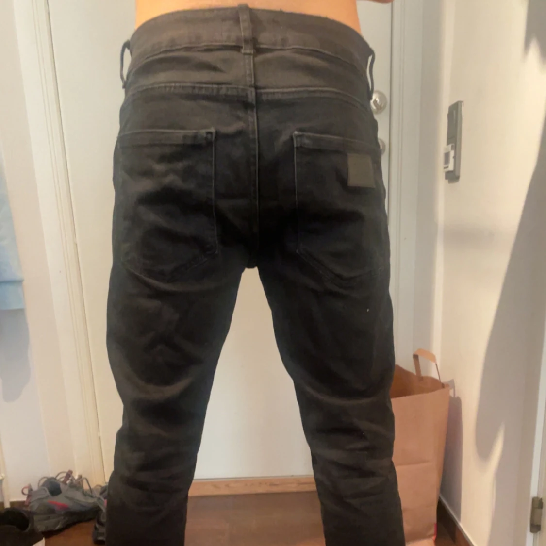 Säljer ett par svarta jeansbyxor med tapered passform och klassisk femficksdesign. Byxorna har normal midja och är tillverkade i jeansmaterial. Perfekta för dig som gillar en stilren look med lite smalare ben. Passar till sneakers och hoodie.