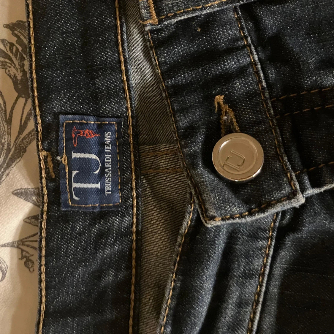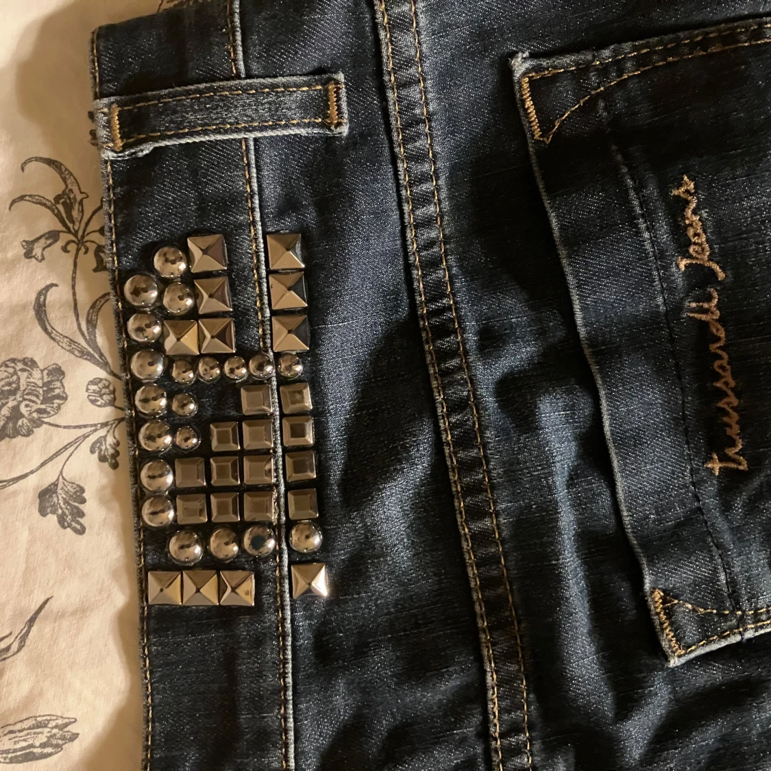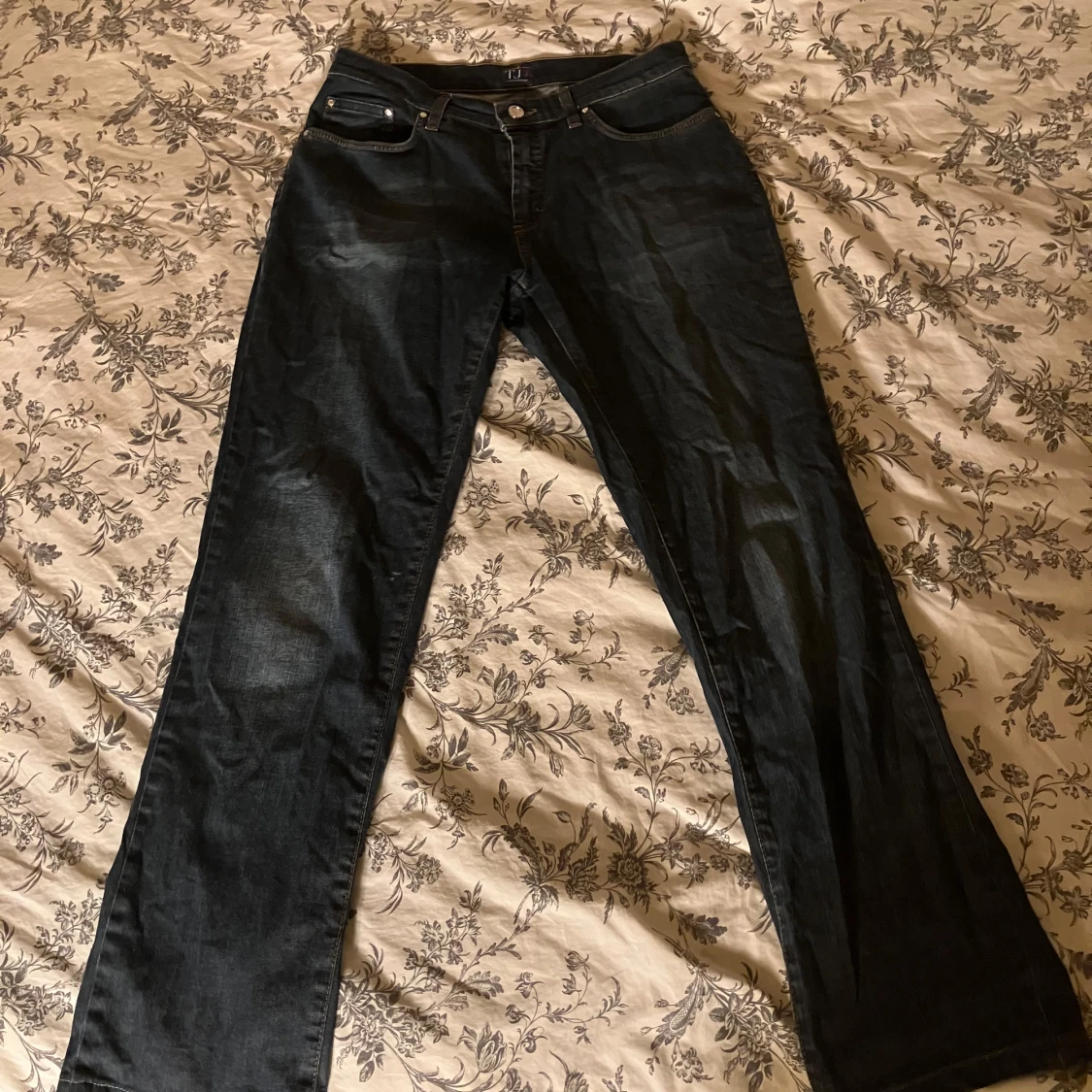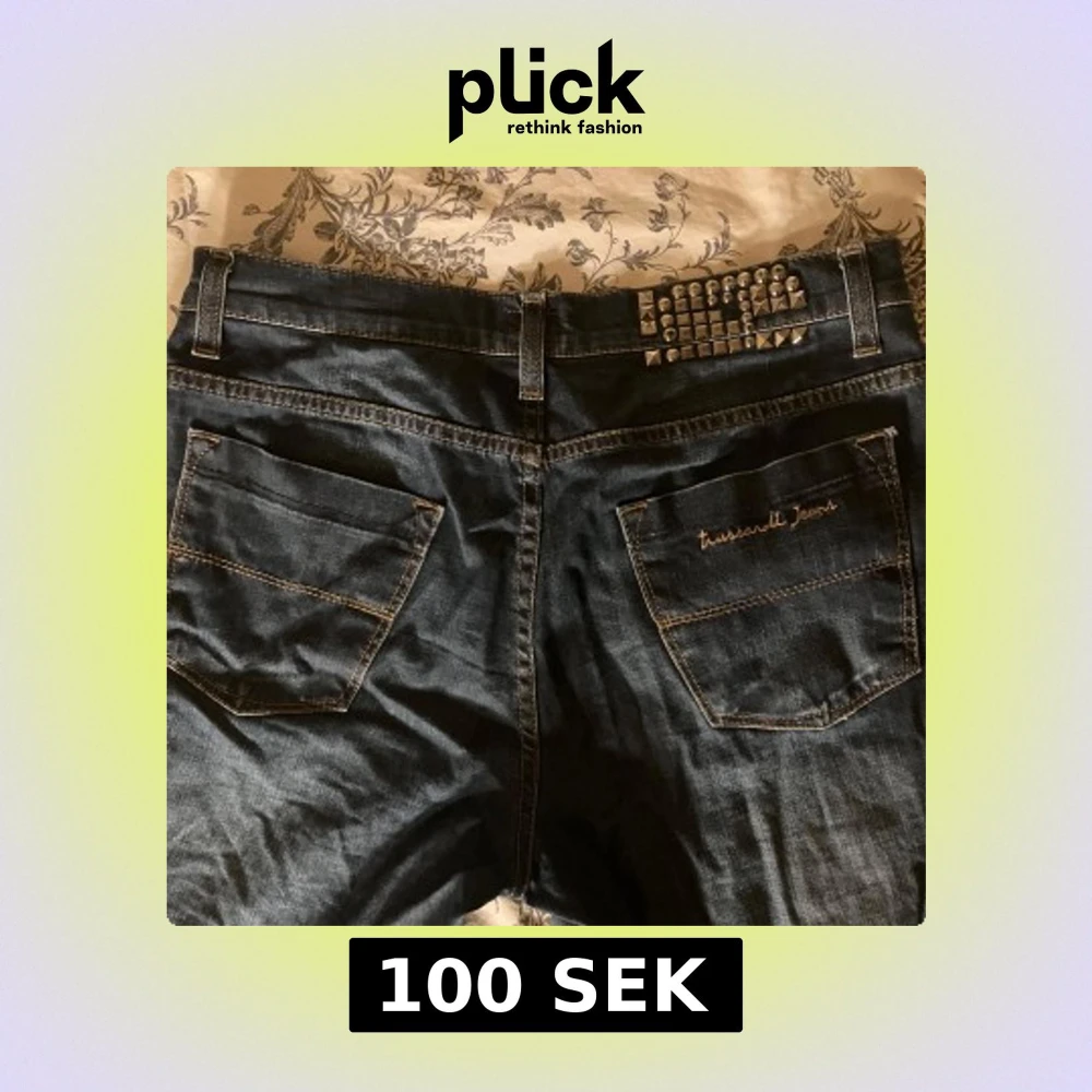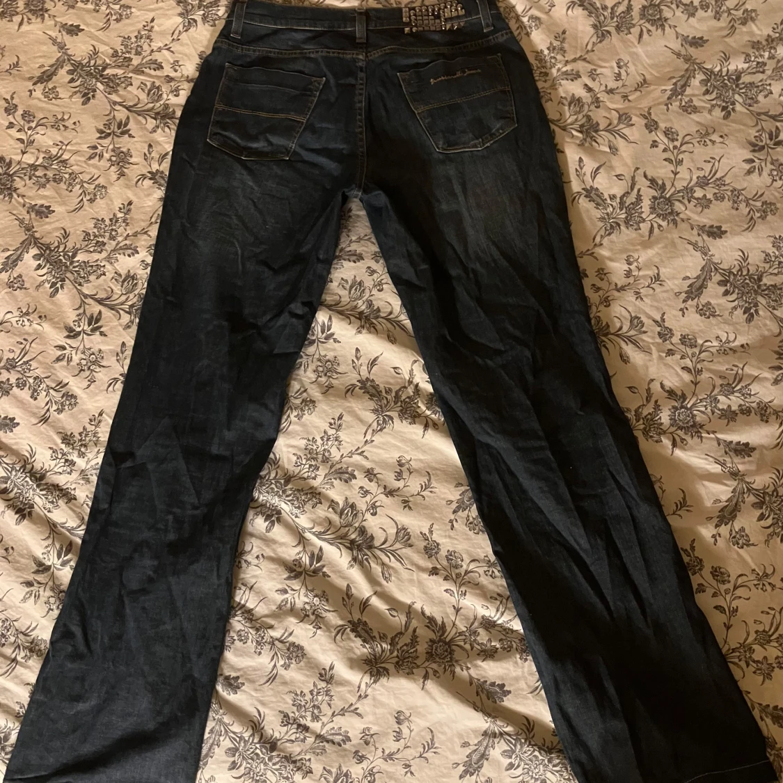Snygga mörkblå vintage jeans som är köpta secondhand :) Har as kola nitar över ena bakfickan istället för en vanlig lapp, några saknas men tycker det ser lika bra ut ändå. Midjemått rakt över- 40 cm Ytterben- 100 cm Innerben- 75 cm Från grenen till midjan- 22 cm Lårbredd 24 cm Benvidd nedtill -19 cm. De har en snygg light tvätt och är i bra skick. Är i relativt stretchigt material även om det är jeans.