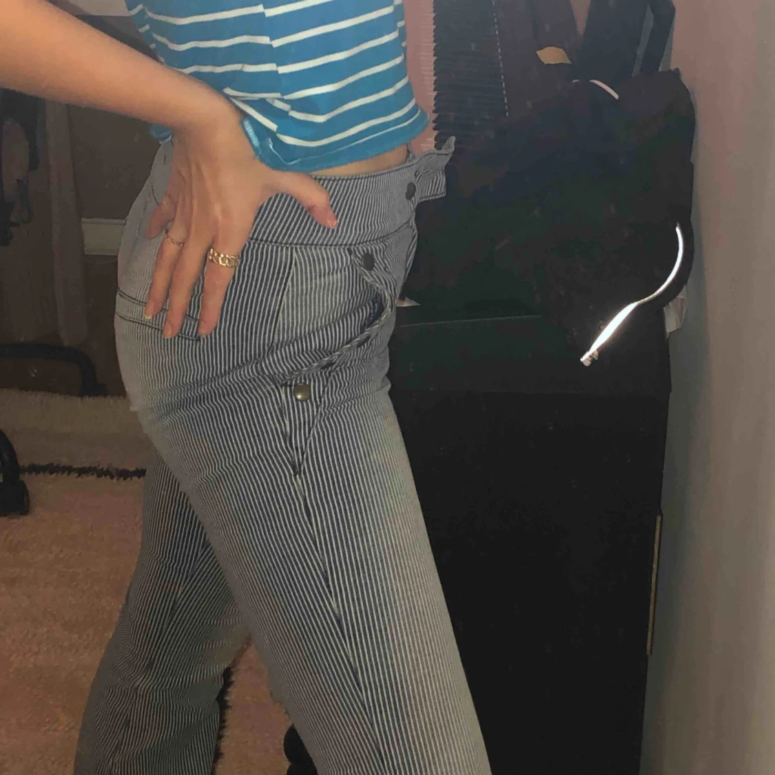 Jätte snygga flare byxor från hunkydory! Vit blå randiga! Saknas en knapp där man stänger. Frakt ingår ej i priset 🍒