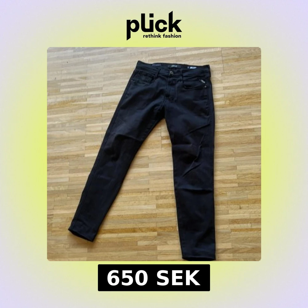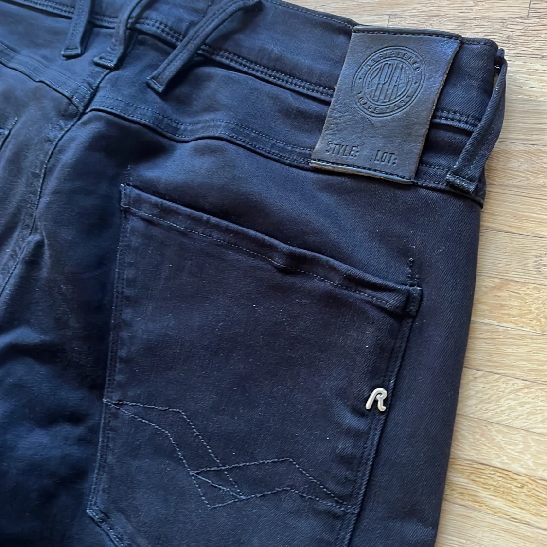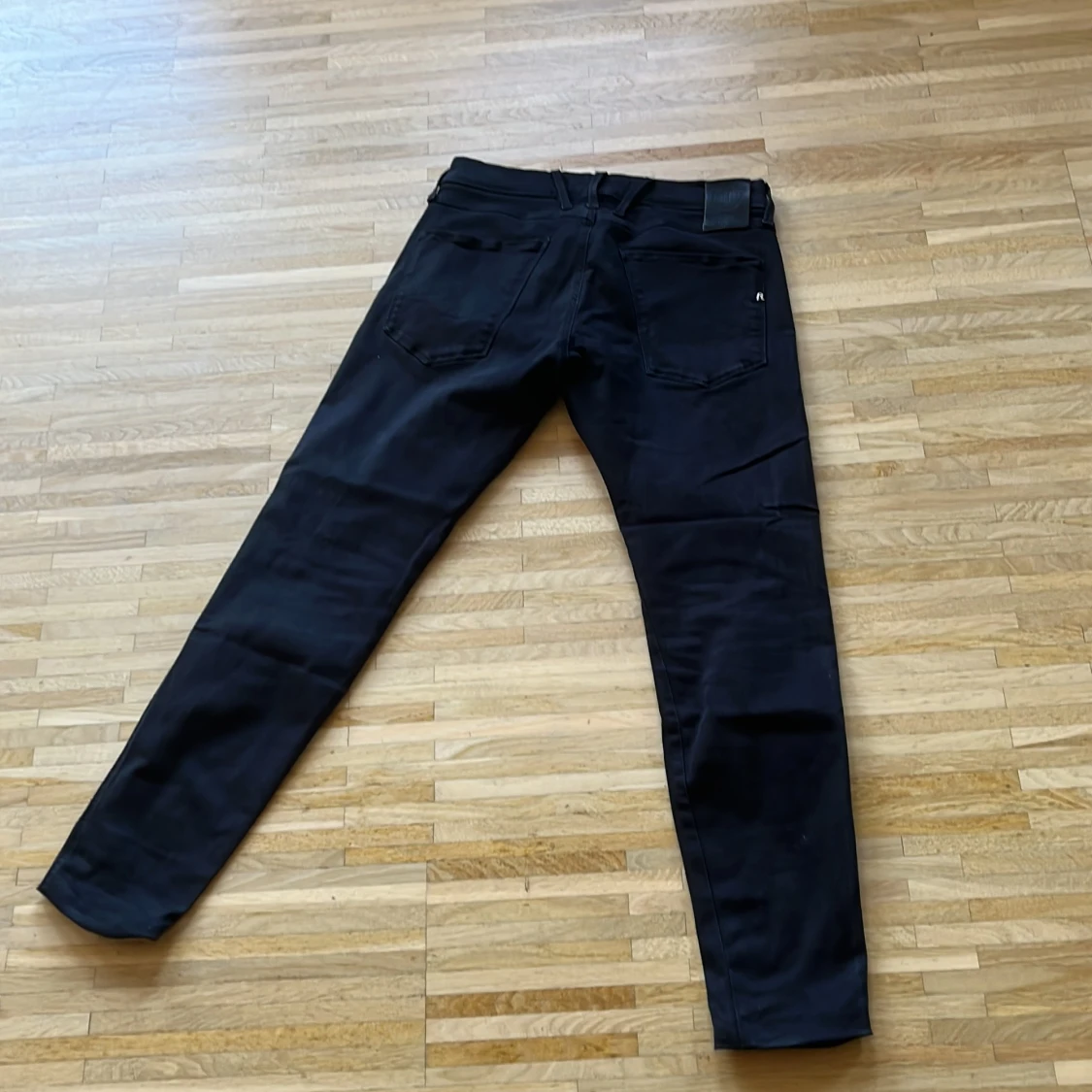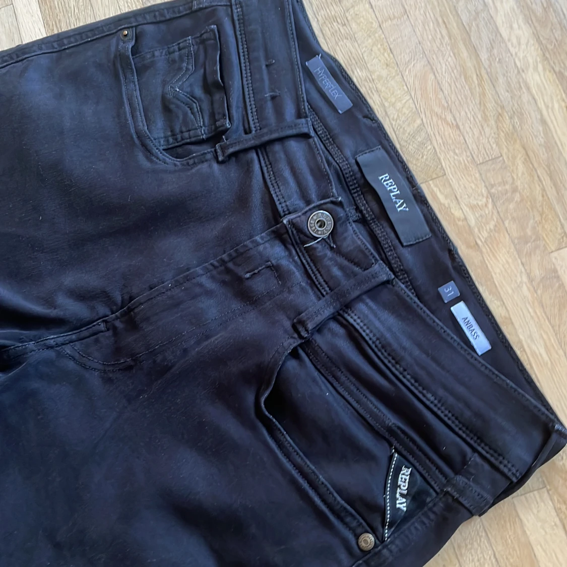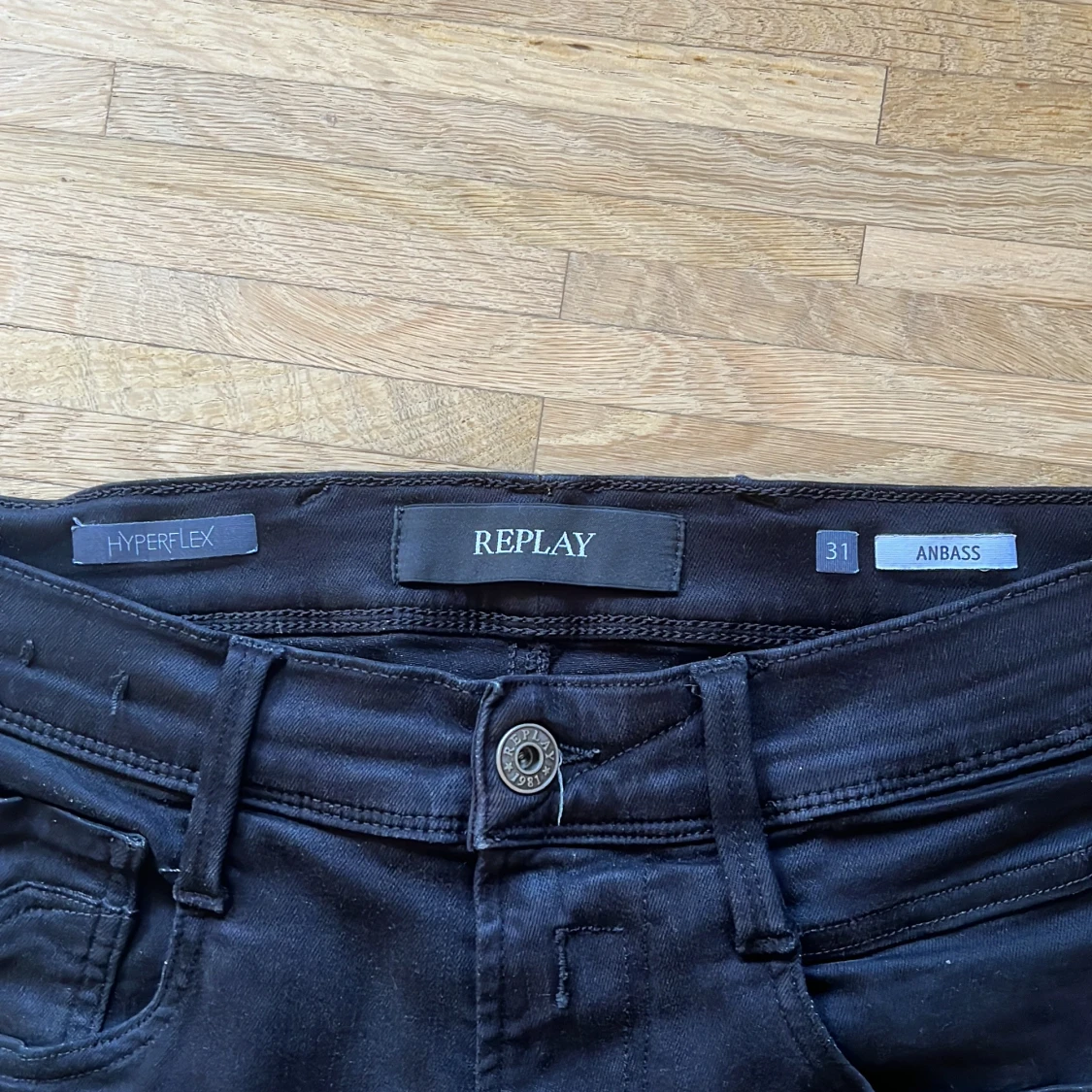 Svarta Replay Anbass Hyperflex jeans med klassisk femficksdesign och snygga detaljer som metall-logga på bakfickan. Stretchigt material för extra komfort och smal passform. Perfekta för dig som gillar stilrena och moderna jeans. Storlek 31/32