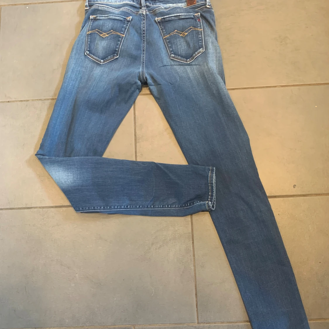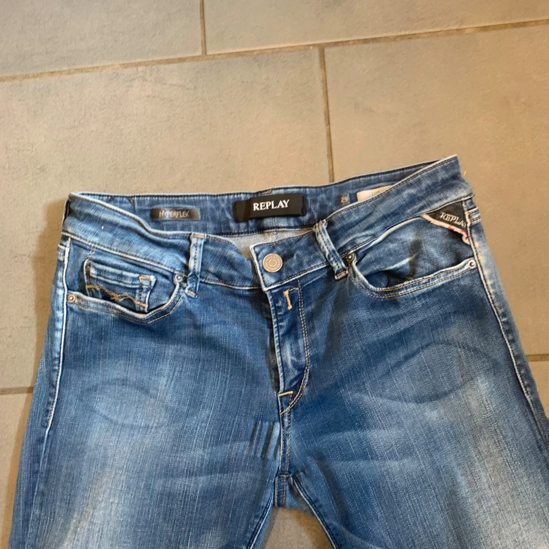 Säljer ett par Replay Hyperflex jeans i klassisk blå tvätt med snygga slitningar. Modellen är skinny fit med normal midja och fem fickor. Jeansen har stretchigt material för extra komfort och coola detaljer på bakfickorna.