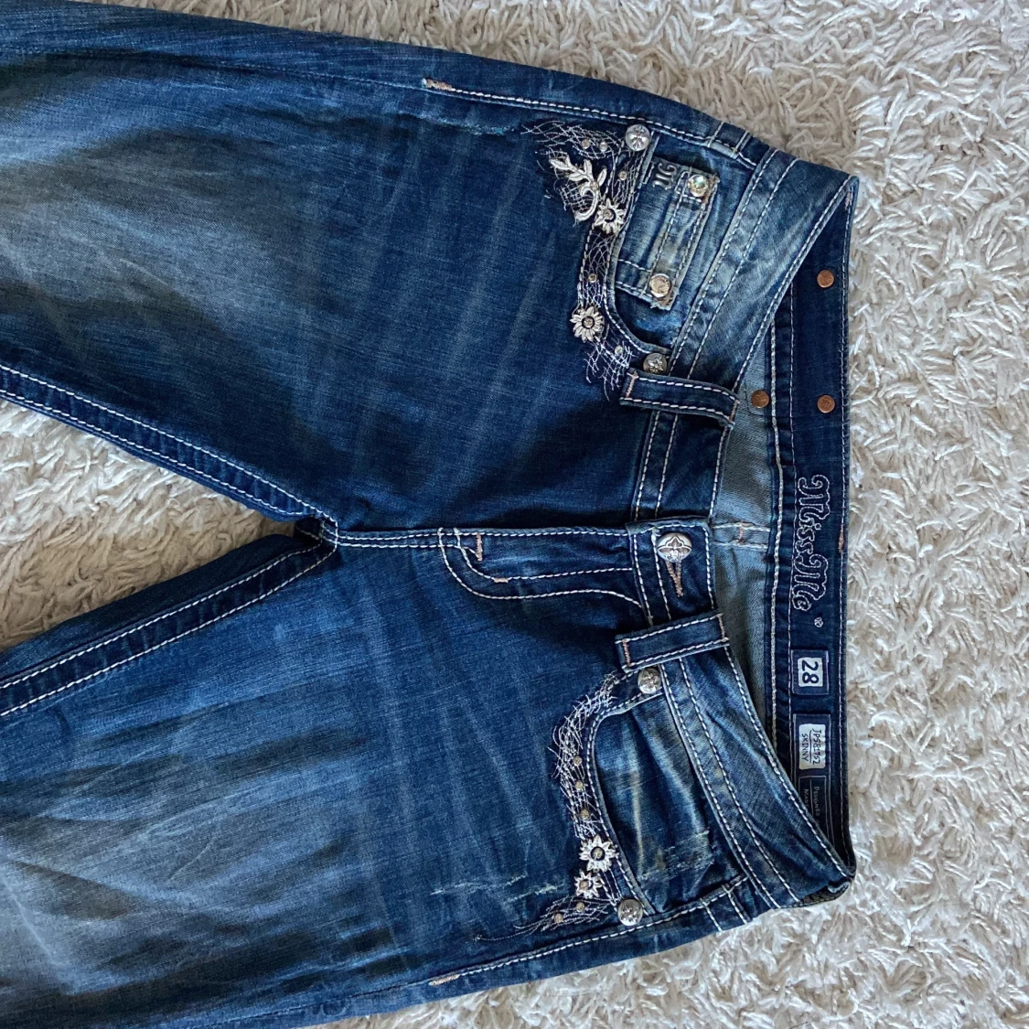 Ett par blåa skinny Miss Me jeans