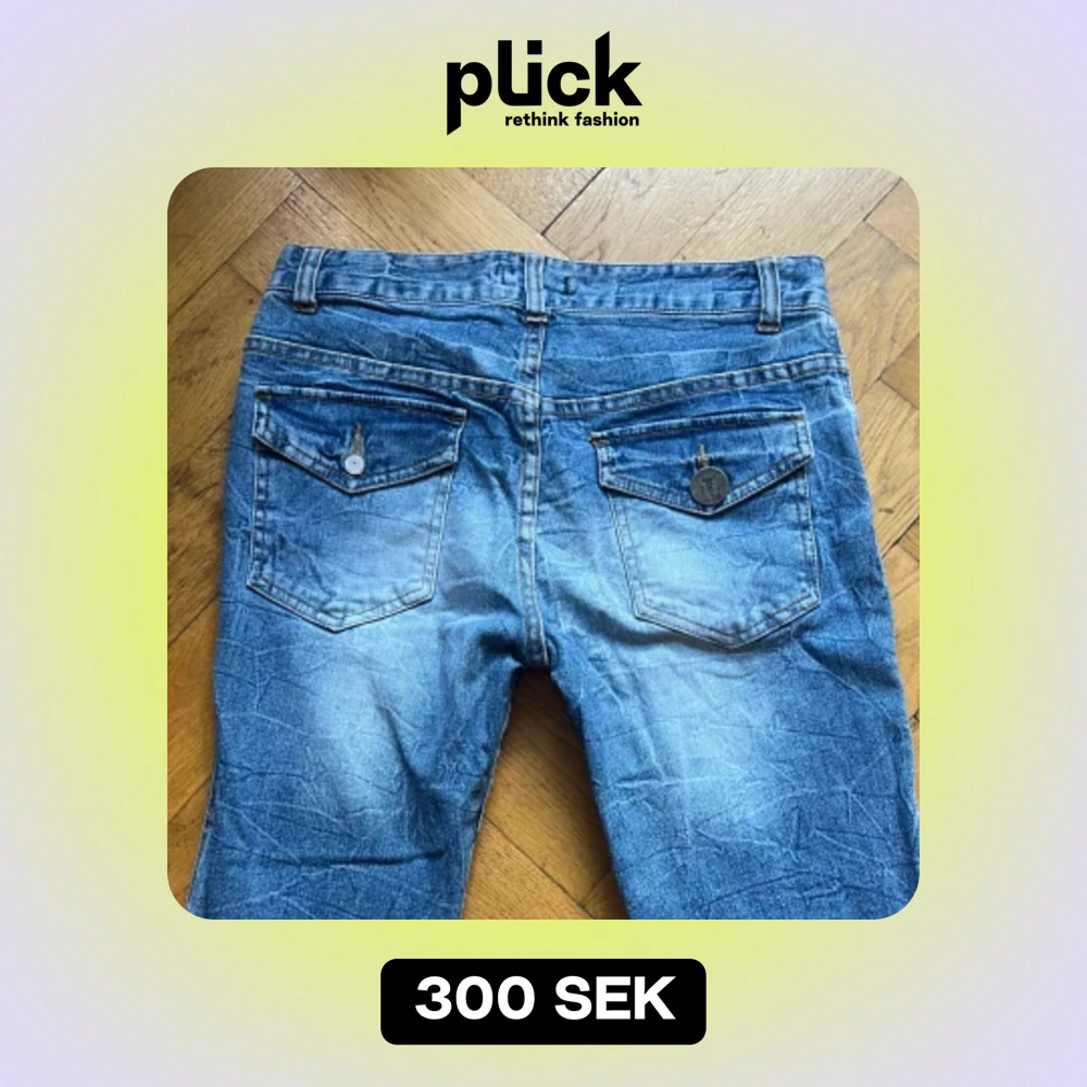 Mått i cm: midja: 36, gren: 23, Innerben: 74. Ena knappen på bakfickan har åkt av.