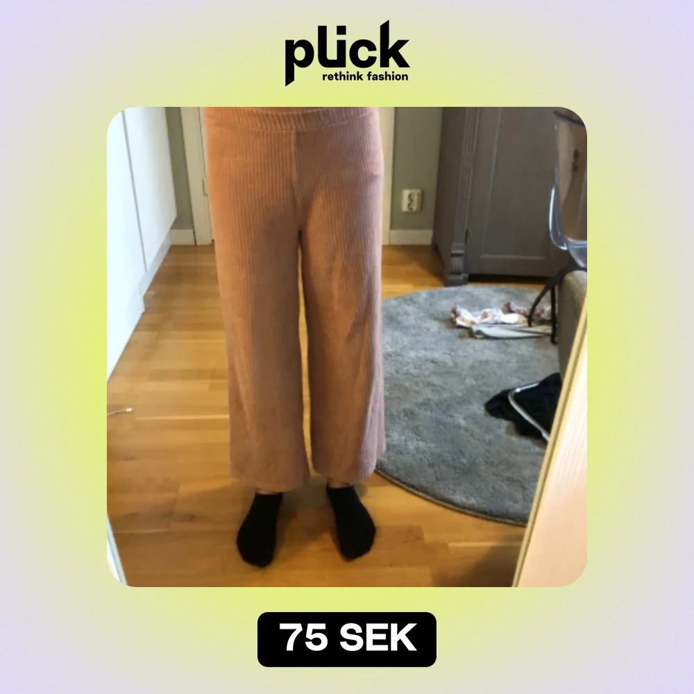Ett par ljusrosa byxor i sammet, de är ribbade och utsvängda. Storleken är 134/140 men skulle säja att de passar 146/152 också. Jag säljer de för att dom är för korta för mig och inte passar.🥰