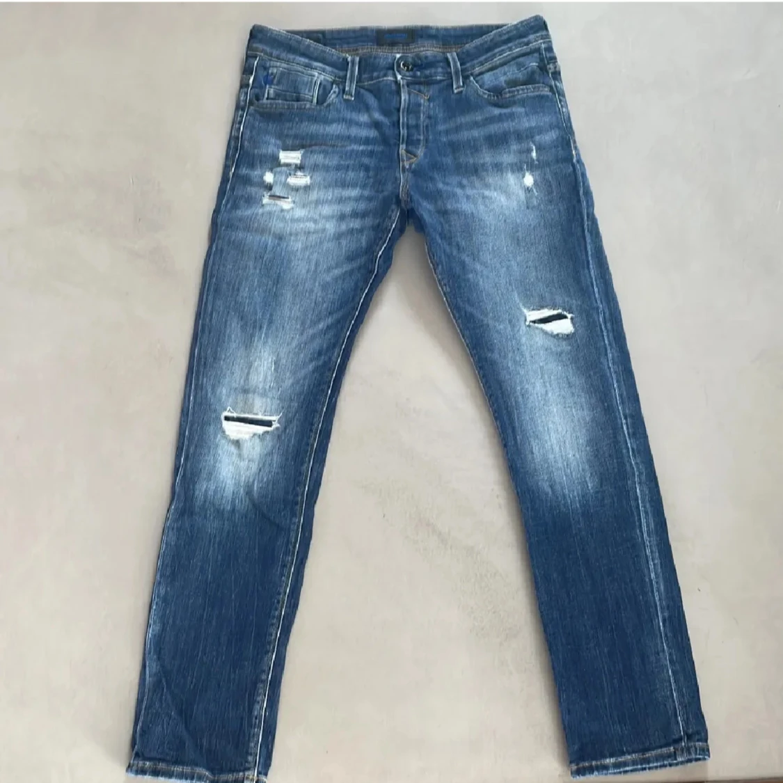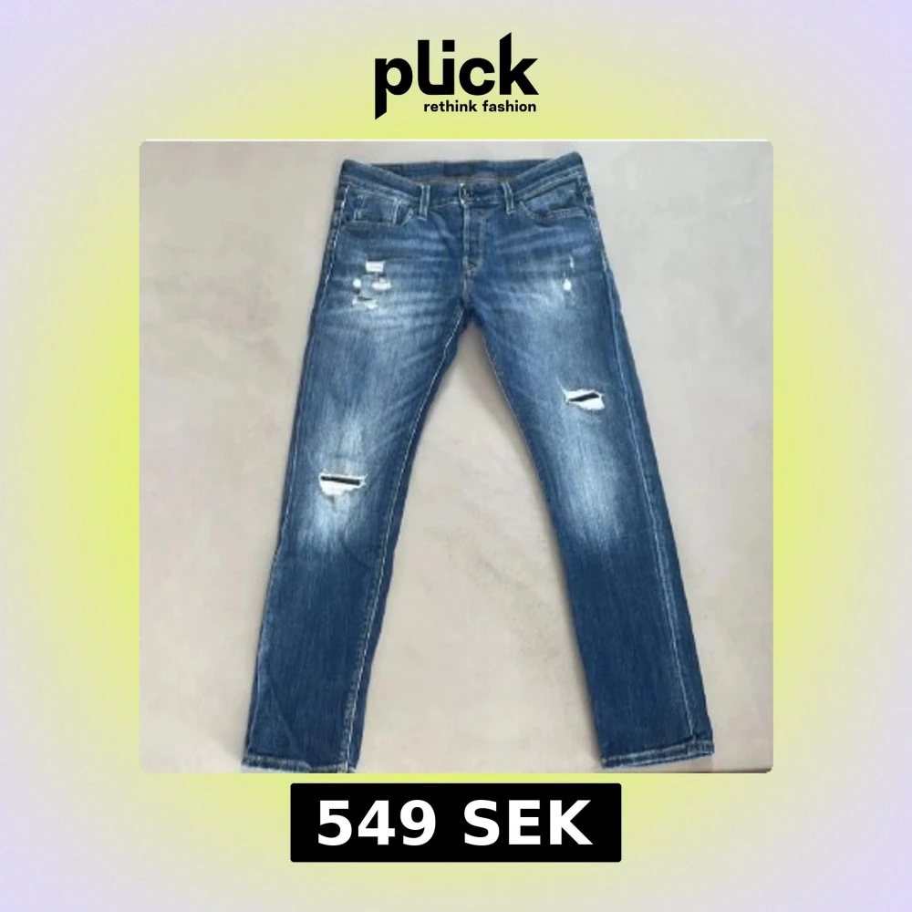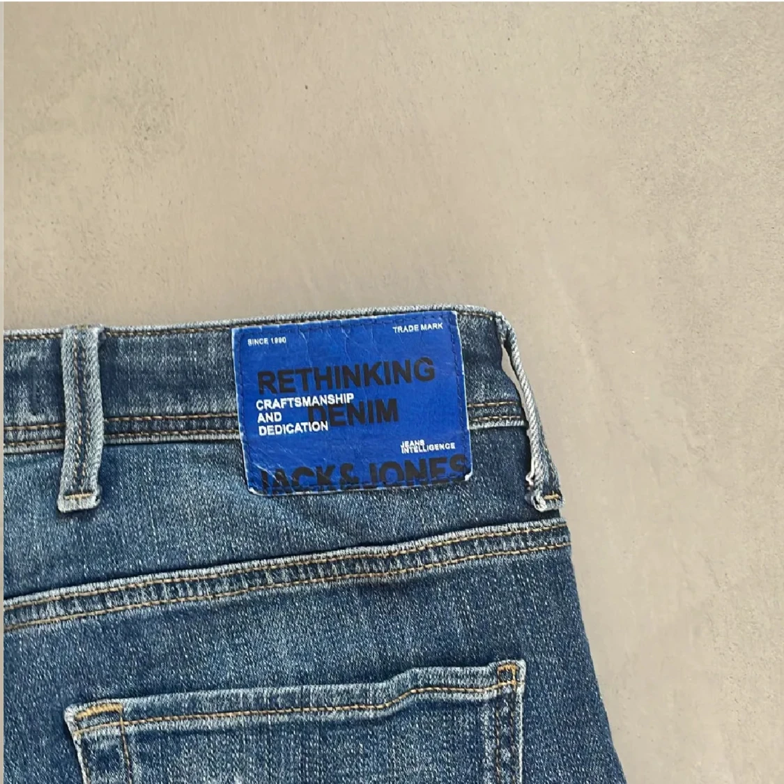 Snygga blå jeans från Jack & Jones med slitningar och hål på framsidan för en cool, avslappnad look. Klassisk femficksmodell med raka ben och normal passform. Jeansen har en blå patch bak i midjan och är tillverkade i jeansmaterial. Skriv vid funderingar 🟩
