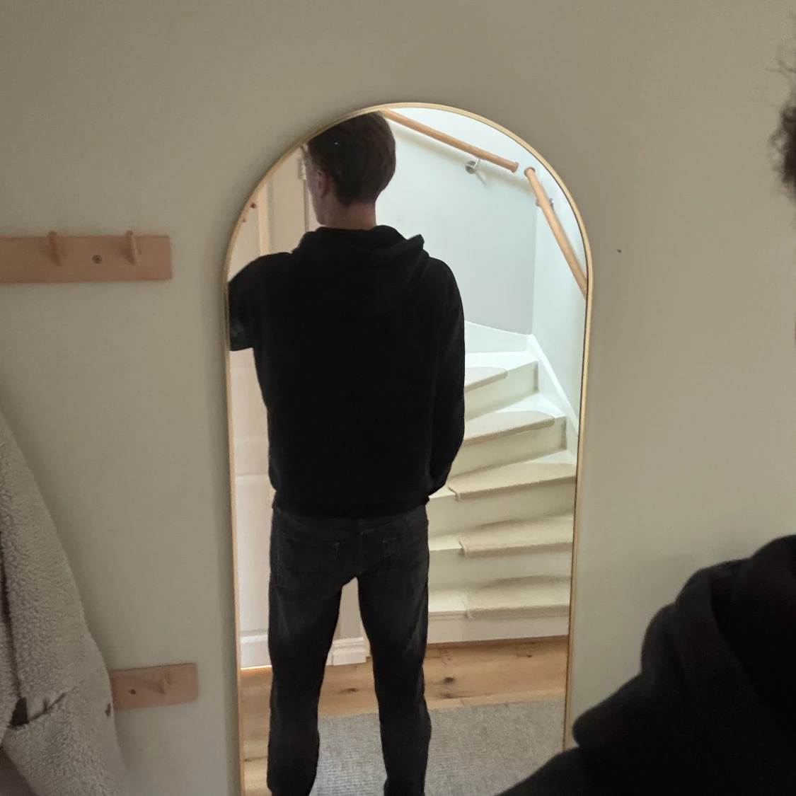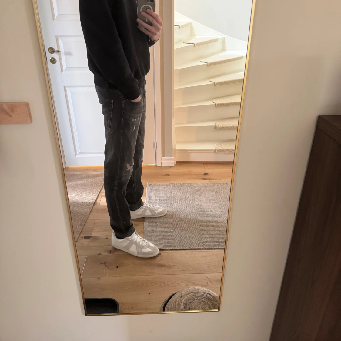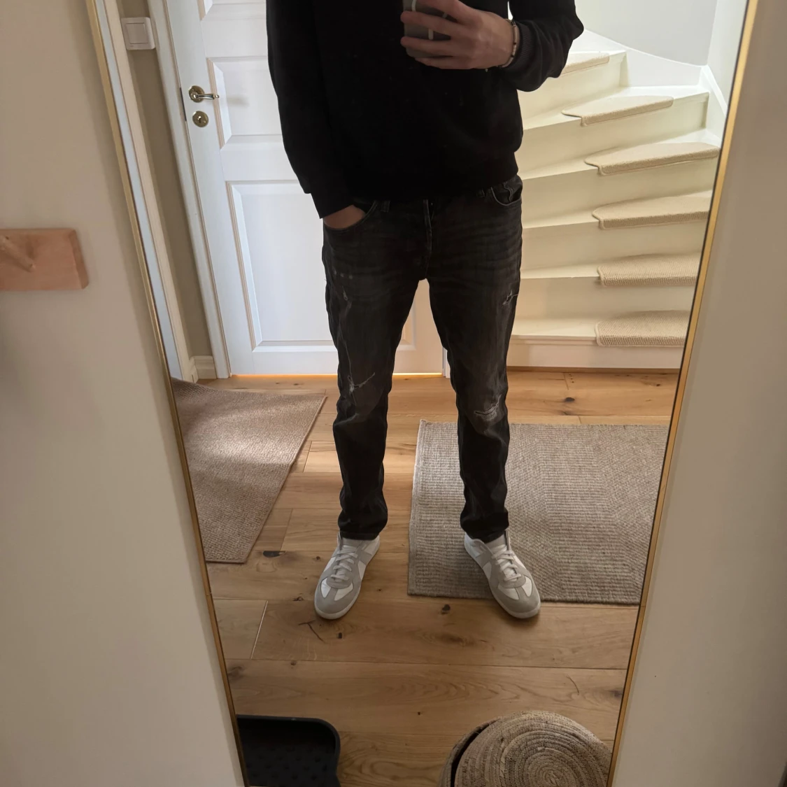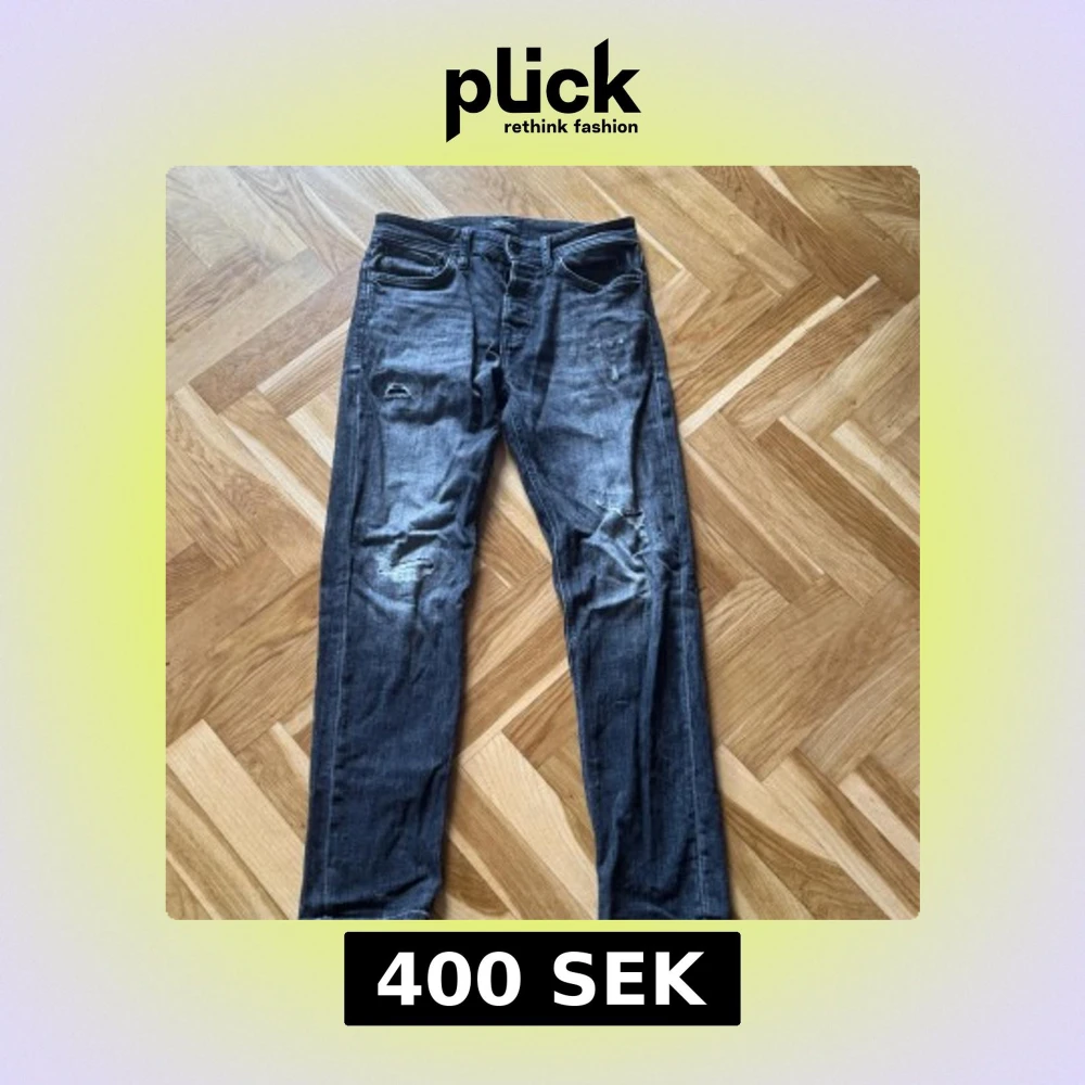Säljer ett par mörkgrå jeans från Jack and Jones (Mike Tapered fit) med slitna detaljer och lagningar på knäna.