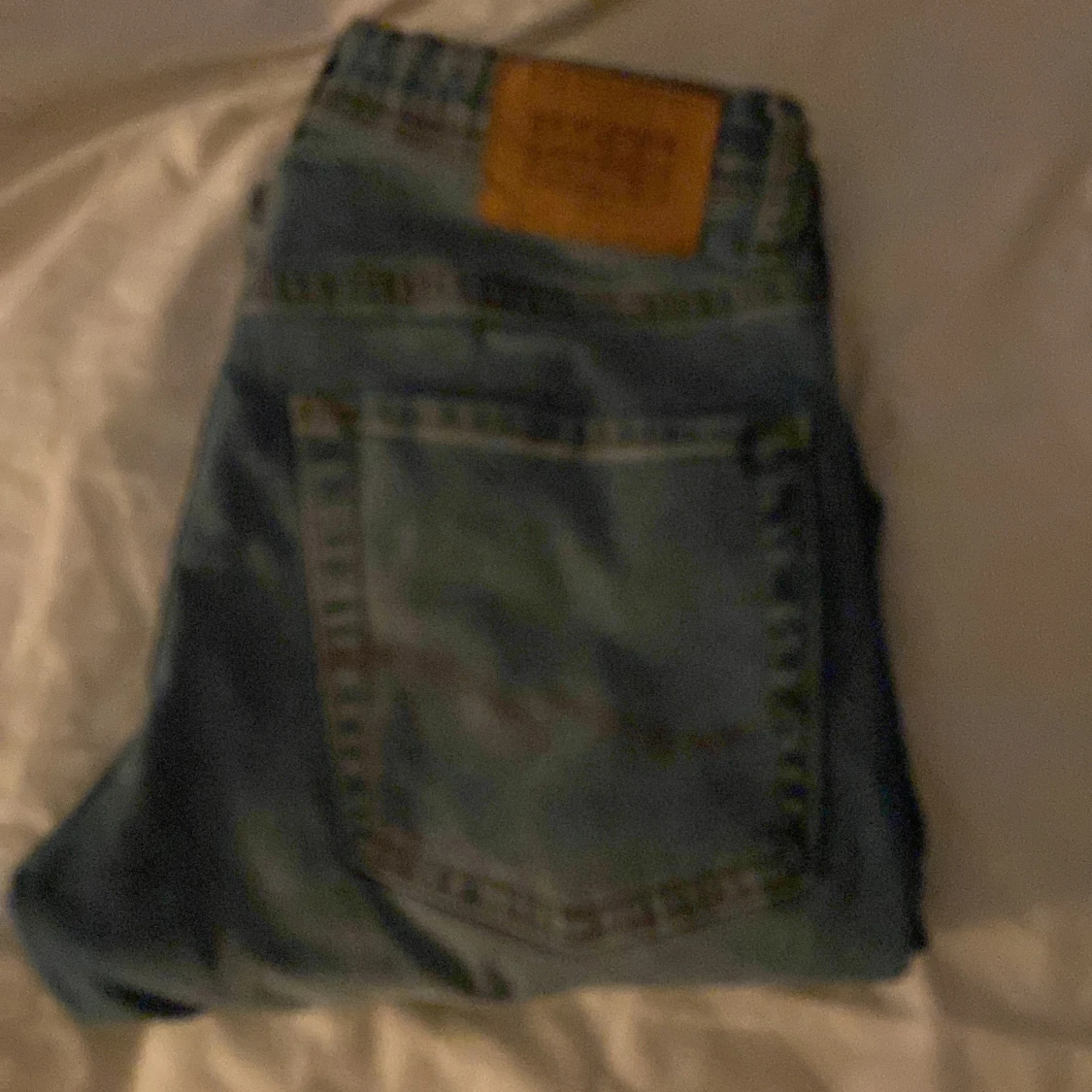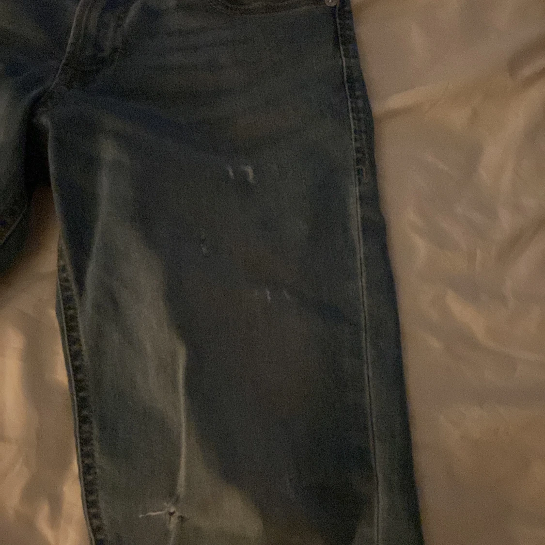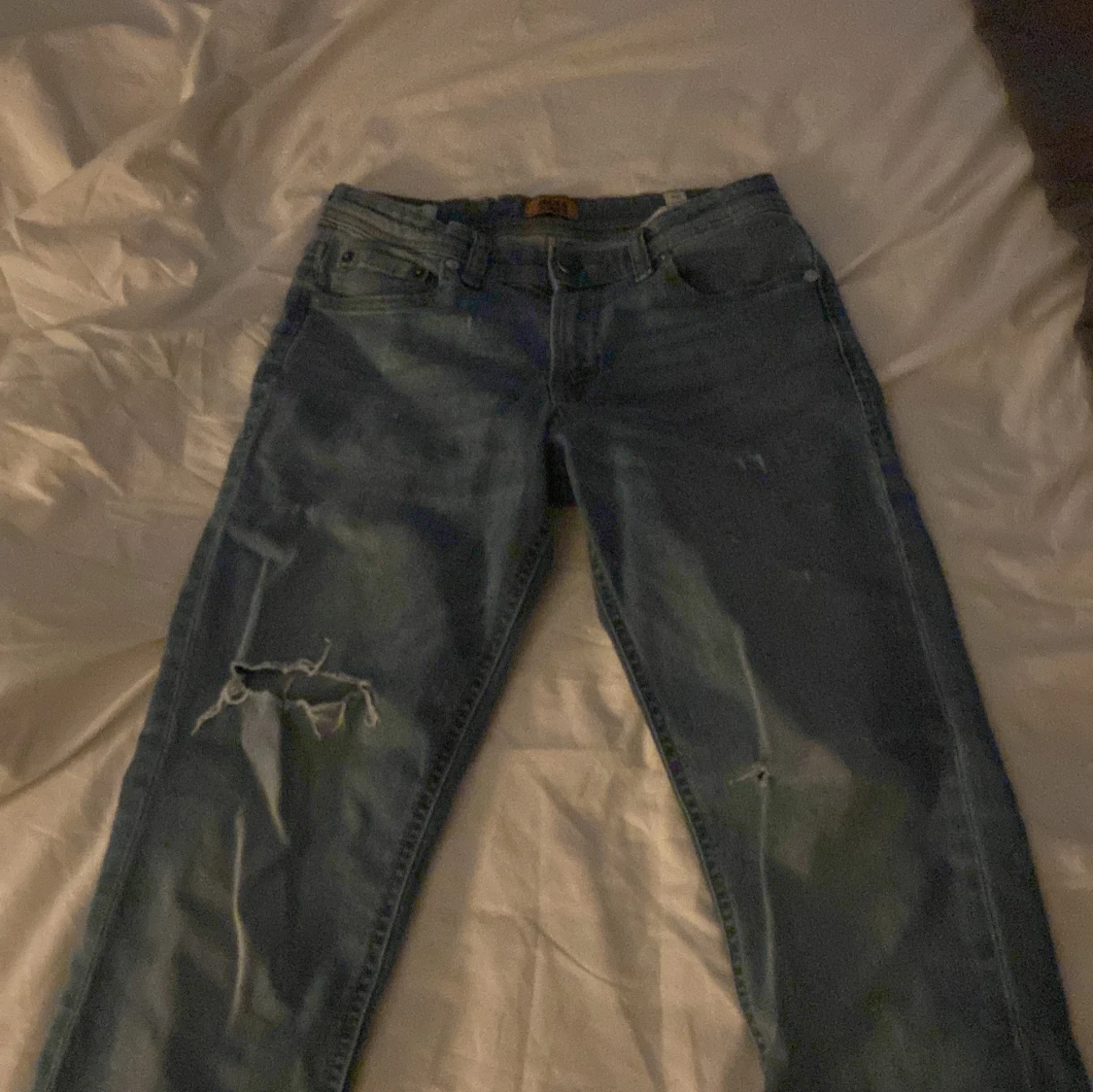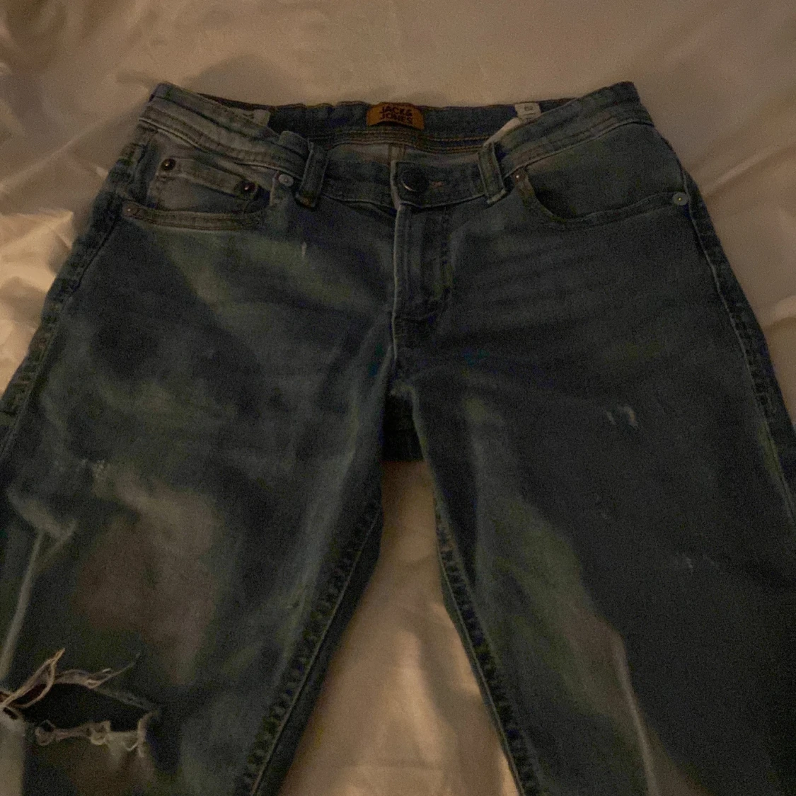 Säljer ett par blå jeans från Jack & Jones i storlek 152. Jeansen har klassisk femficksdesign, slitningar och hål på ena benet för en cool, avslappnad look. De är raka i modellen och har normal passform. Perfekta för dig som gillar streetstyle.