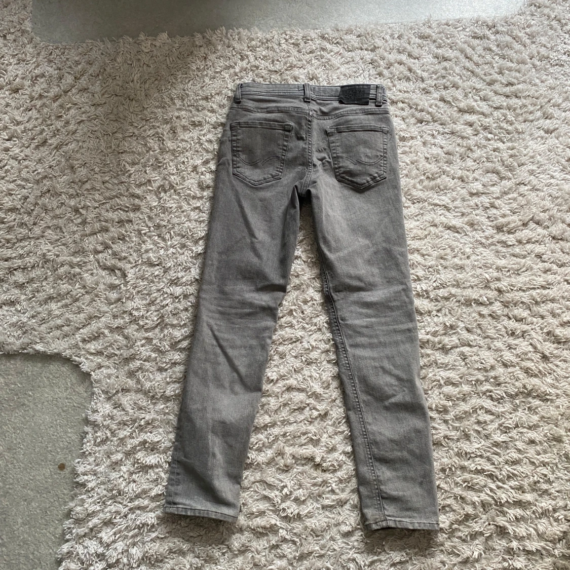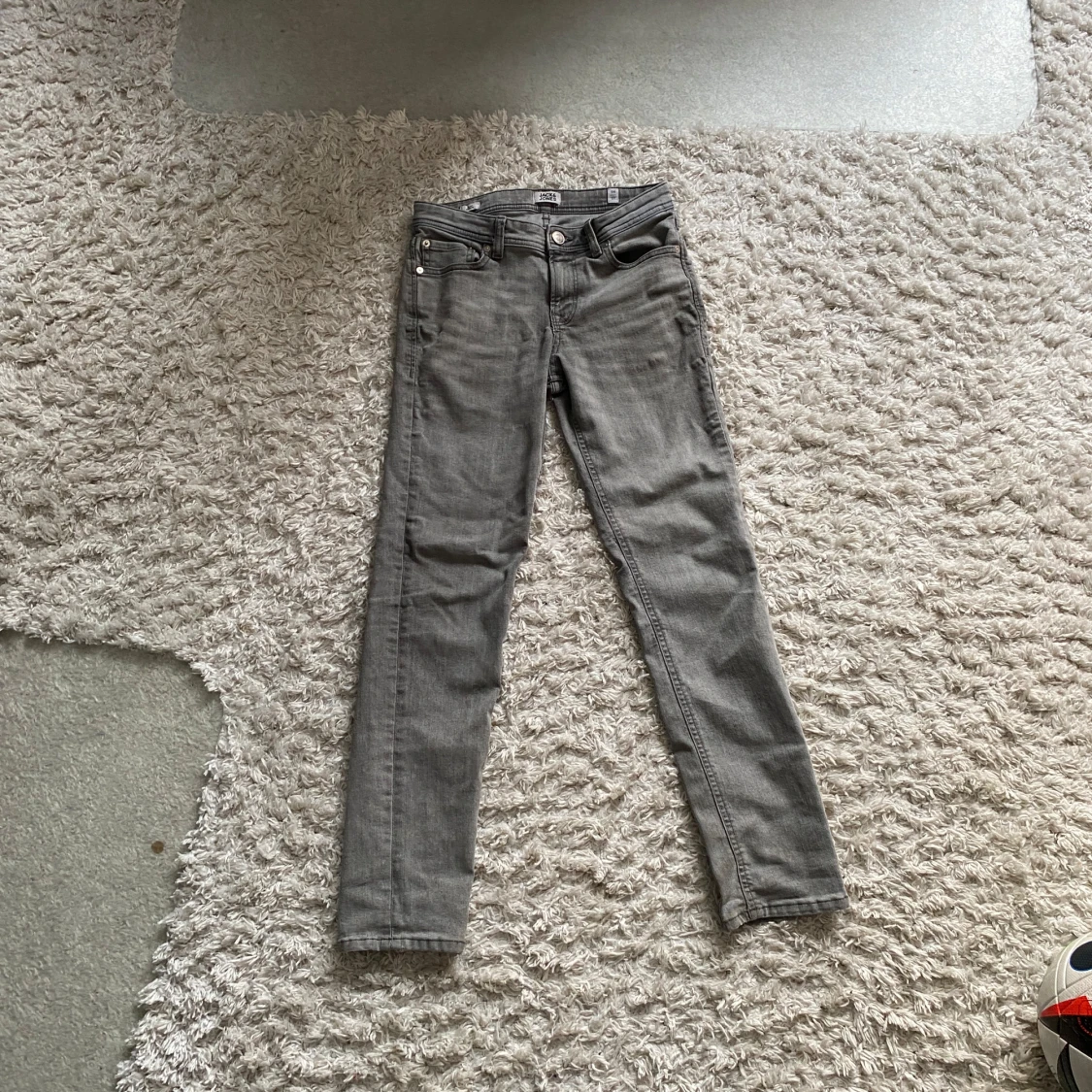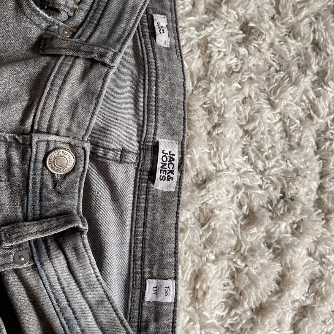 Snygga grå jeans från Jack & Jones i en klassisk straight fit. Det är storlek 158 och model Slim Glenn. Märket på baksidan är inte i det bästa skicket och små delar på fickorna är slitna. Perfekta för en stilren look samt passar med allt.