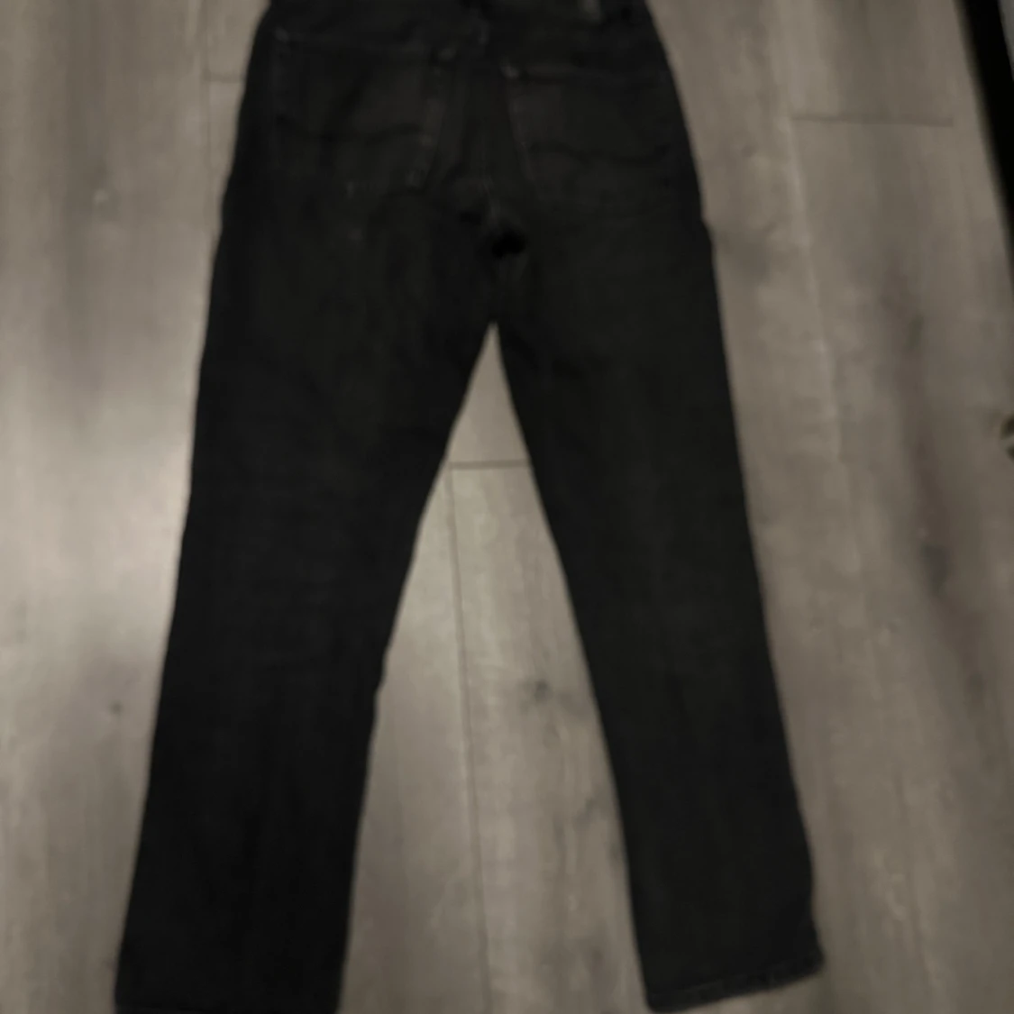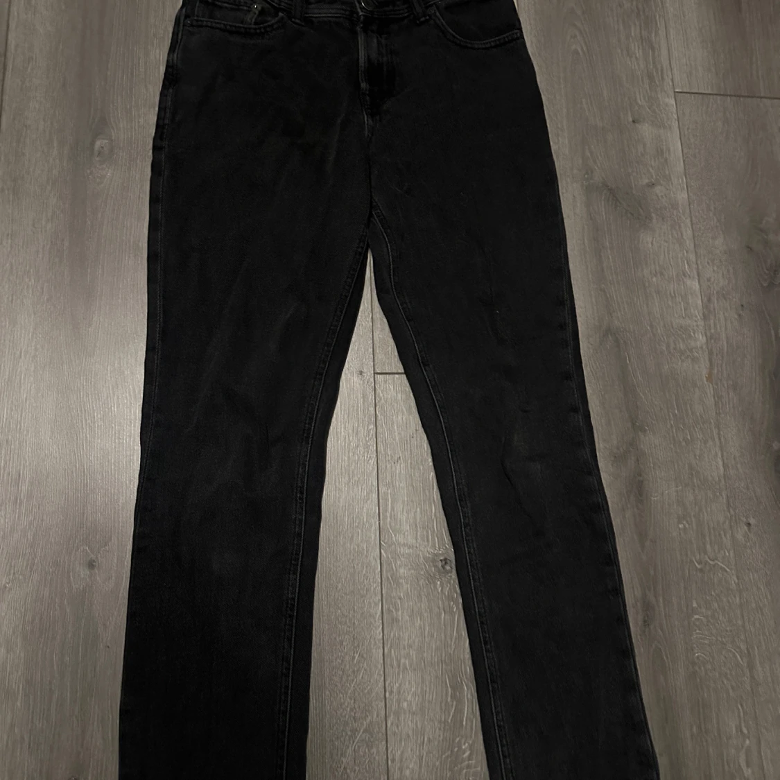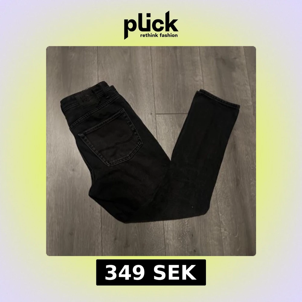 Säljer ett par svarta jeans från Jack & Jones med klassisk femficksdesign och rak passform. Jeansen har en mörk tvätt och är tillverkade i slitstarkt denimtyg. Perfekt för dig som gillar en enkel och stilren look.