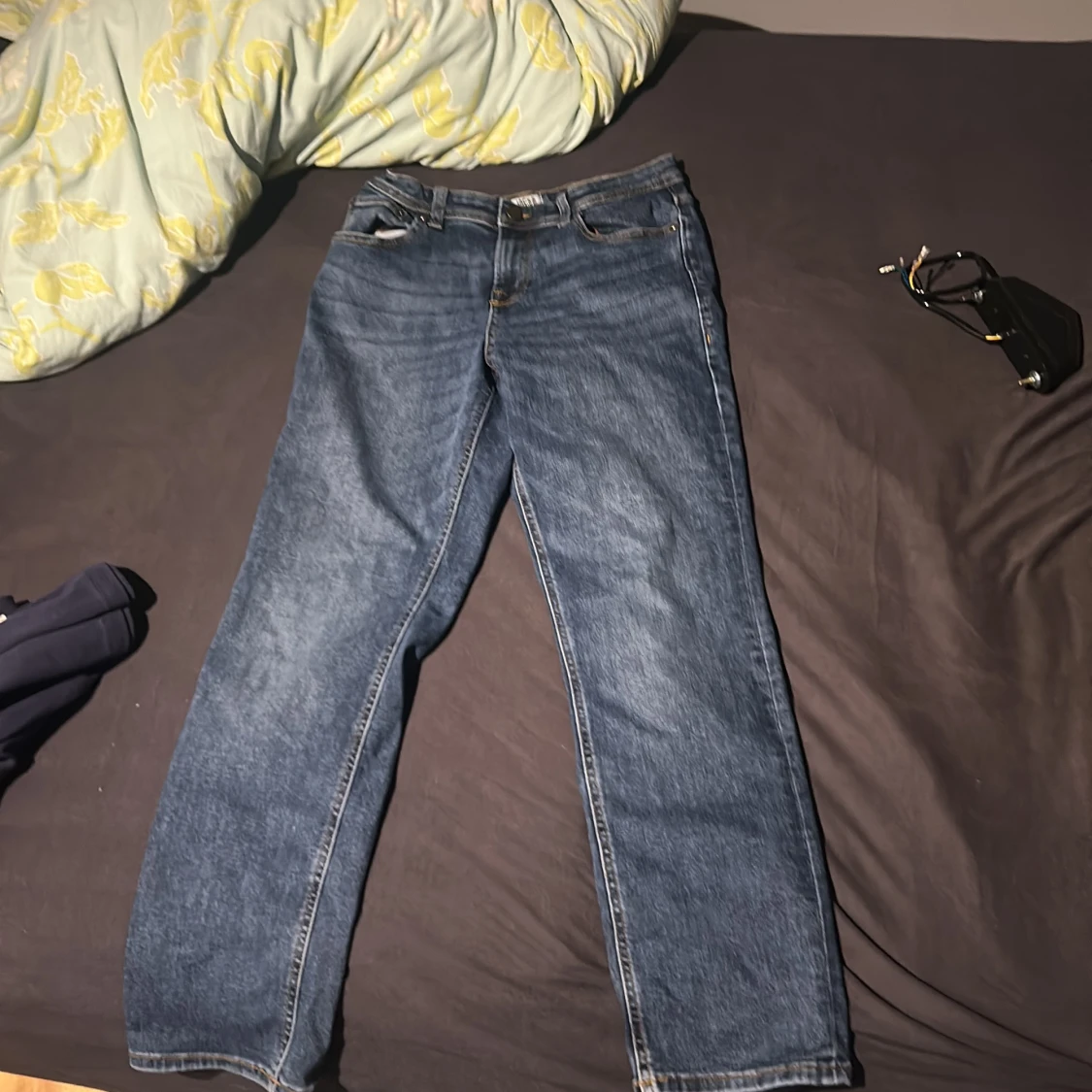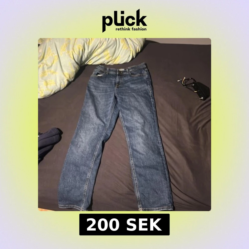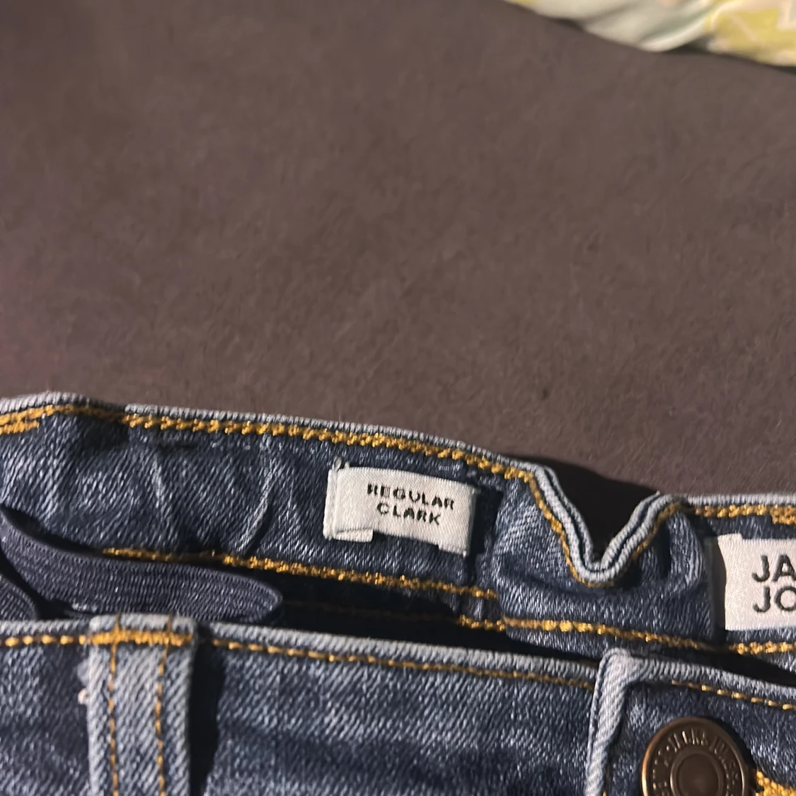Säljer ett par klassiska blå jeans från Jack & Jones, modell Regular Clark. Jeansen har rak passform, normal midja och snygga kontrastsömmar. Perfekta för dig som gillar en tidlös look och vill ha ett par bekväma jeans.