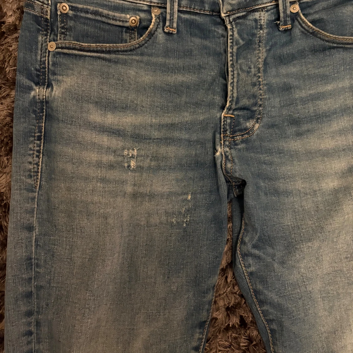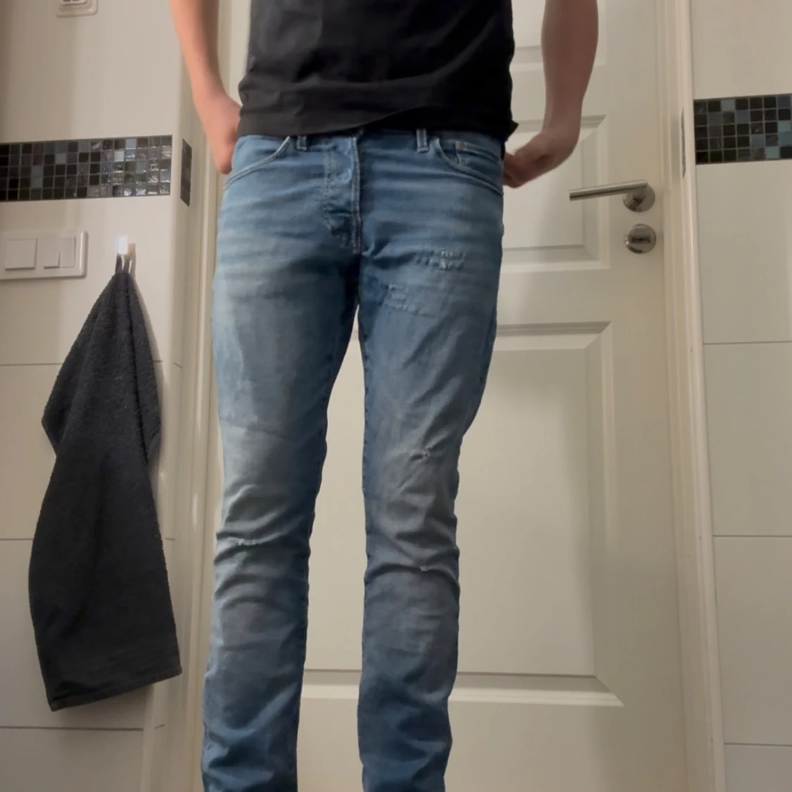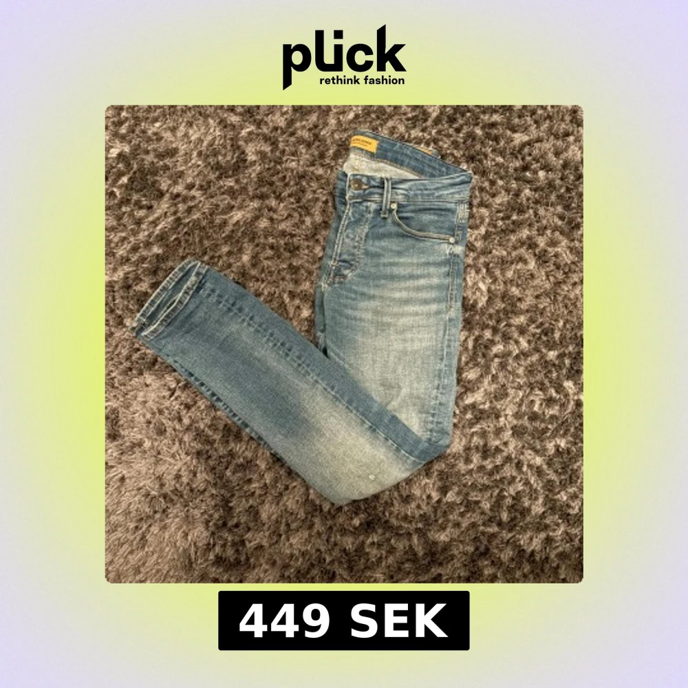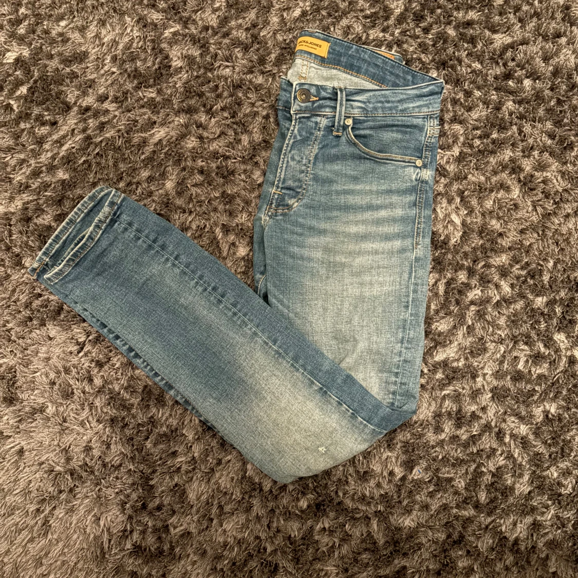 Snygga blå jeans från Jack & Jones, modell Slim Glenn. Jeansen har en slim passform, klassisk femficksdesign och ljus tvätt med lätt slitna detaljer. Perfekta för dig som gillar en stilren look. Köpte de för 800 kr på Jack and Jones.
