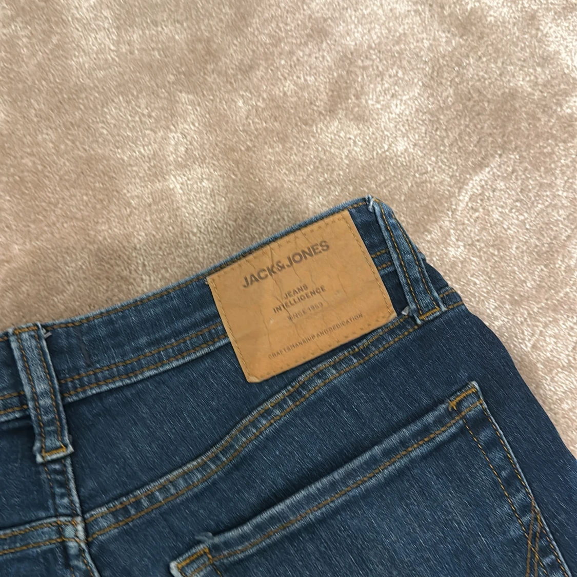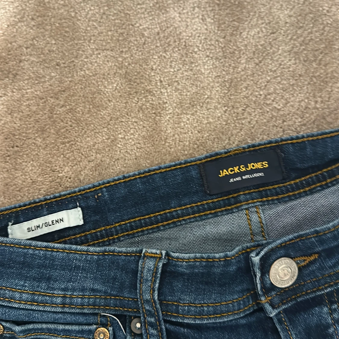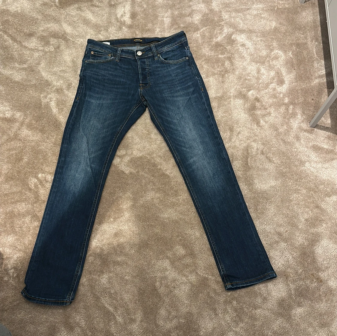 Skick: 9/10. Snygga blå jeans från Jack & Jones, modell Slim Glenn. Jeansen har klassisk femficksdesign, slim fit-passform och kontrastsömmar. Tillverkade i bomull med en mörkblå tvätt och subtila slitningar. Perfekta för en clean och stilren look. Passar personer som är runt 165-173