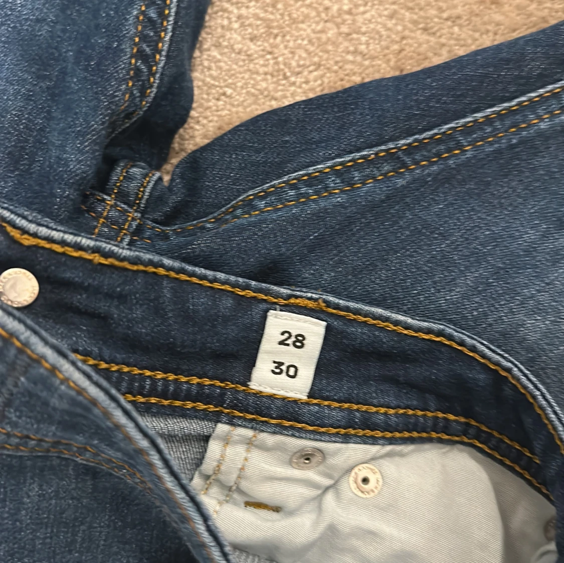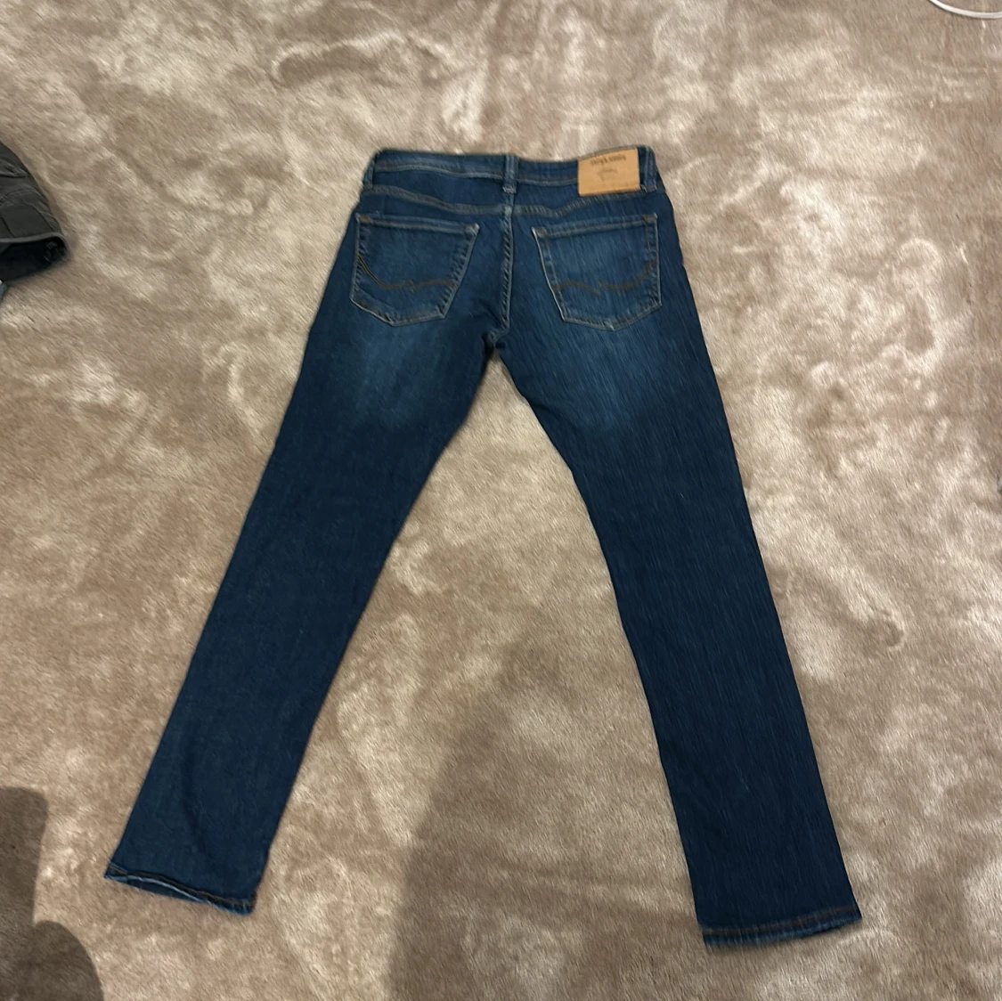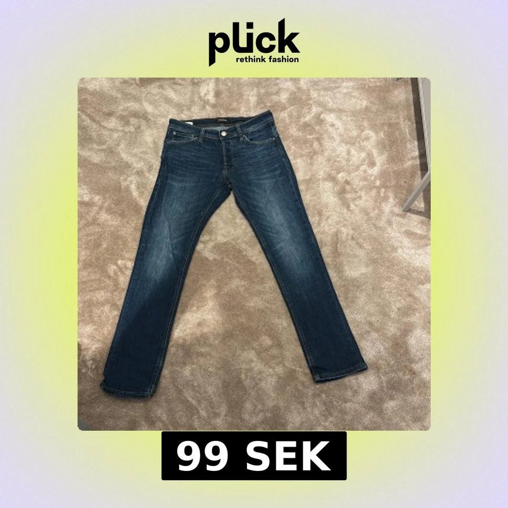 Skick: 9/10. Snygga blå jeans från Jack & Jones, modell Slim Glenn. Jeansen har klassisk femficksdesign, slim fit-passform och kontrastsömmar. Tillverkade i bomull med en mörkblå tvätt och subtila slitningar. Perfekta för en clean och stilren look. Passar personer som är runt 165-173