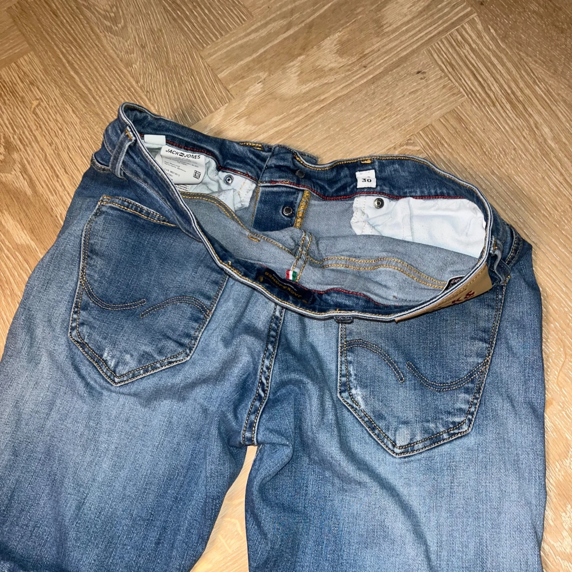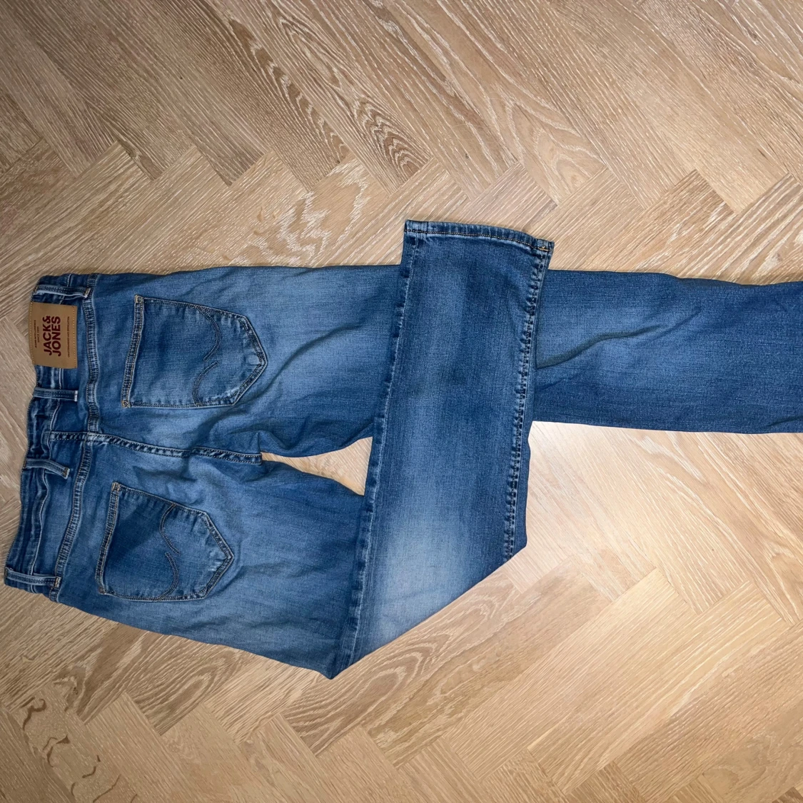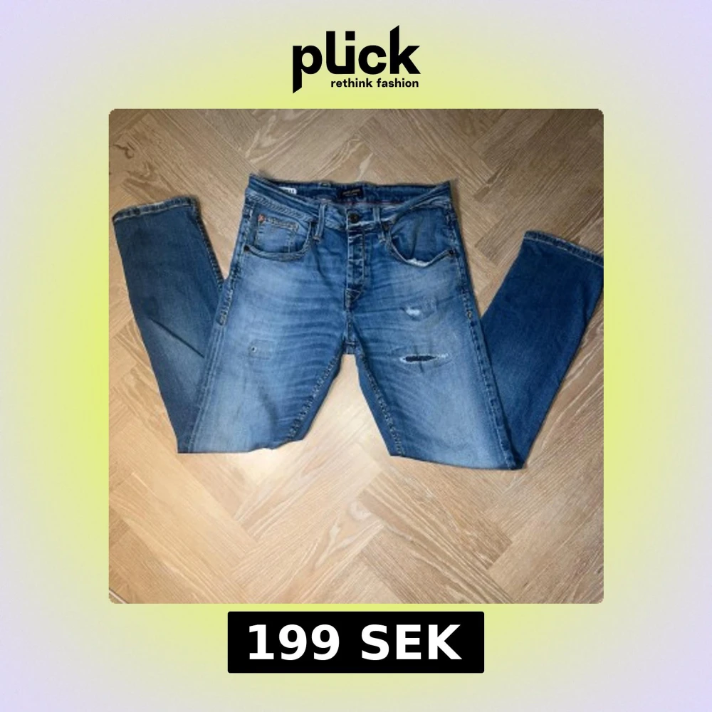 Snygga blå jeans från Jack & Jones med slitna detaljer och klassisk femficksmodell. Jeansen har raka ben och normal passform, tillverkade i tåligt denim med coola slitningar framtill. Perfekta för en avslappnad streetstil.