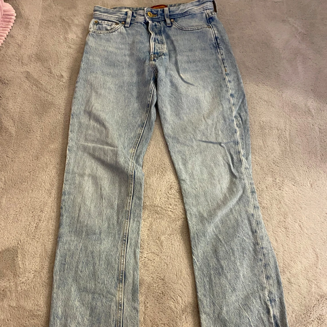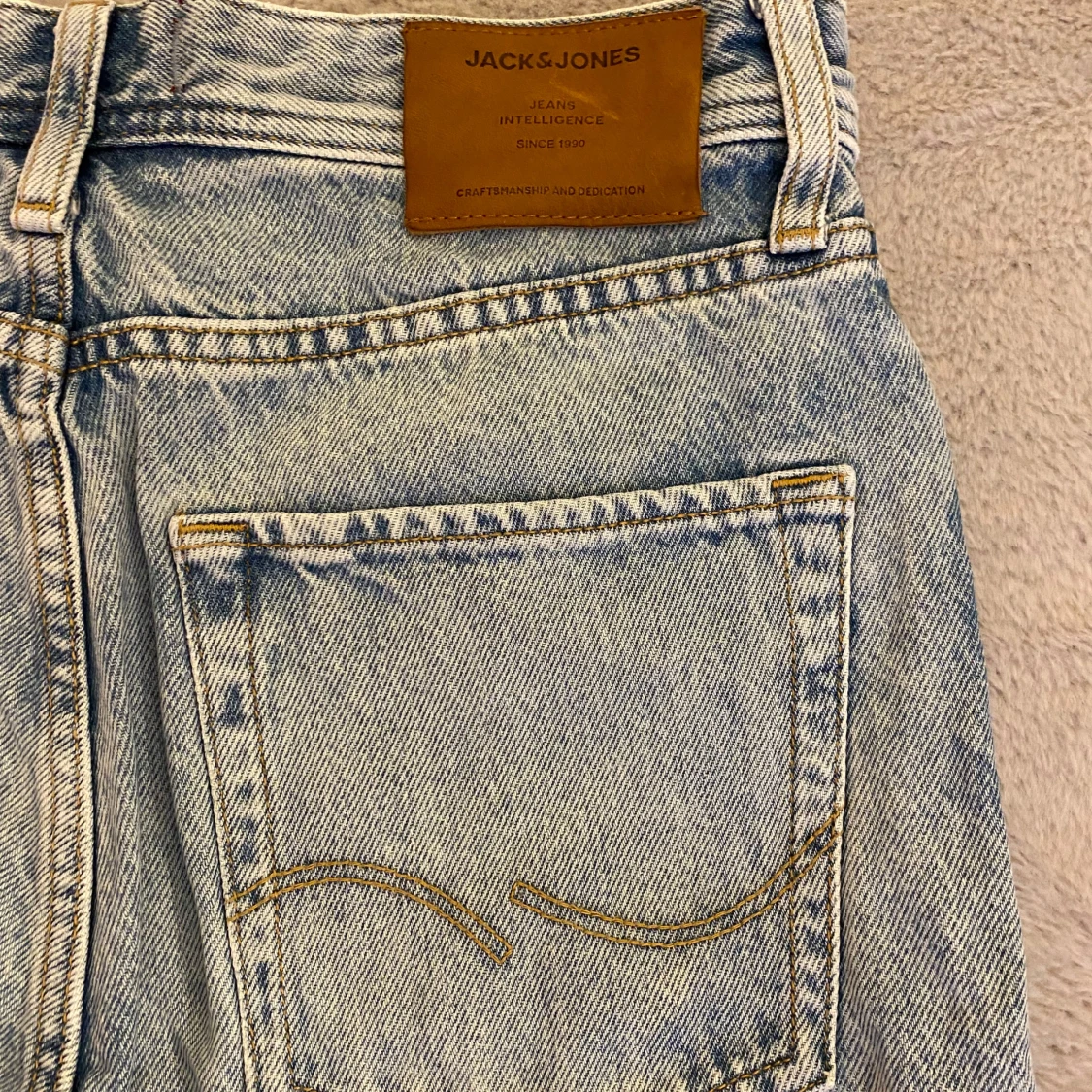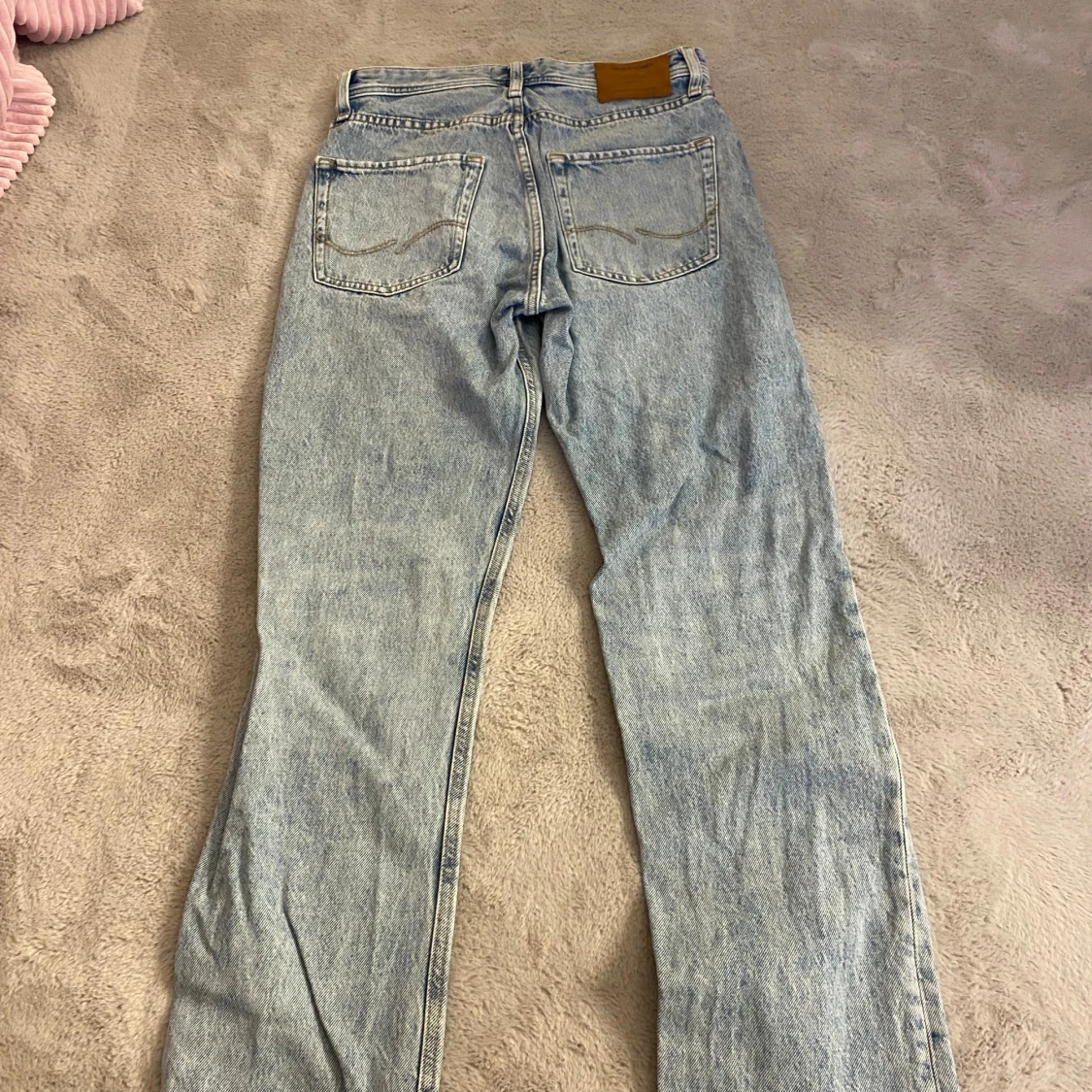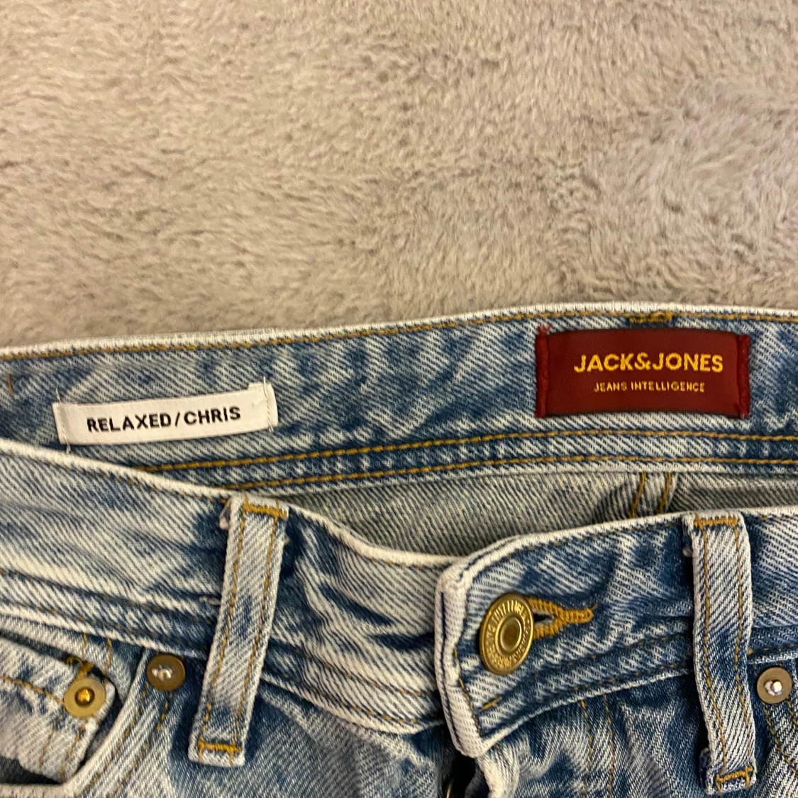 Säljer ett par ljusblå jeans från Jack & Jones med relaxed/Chris fit. De har en klassisk femficksdesign och knappgylf. Perfekta för en avslappnad stil.