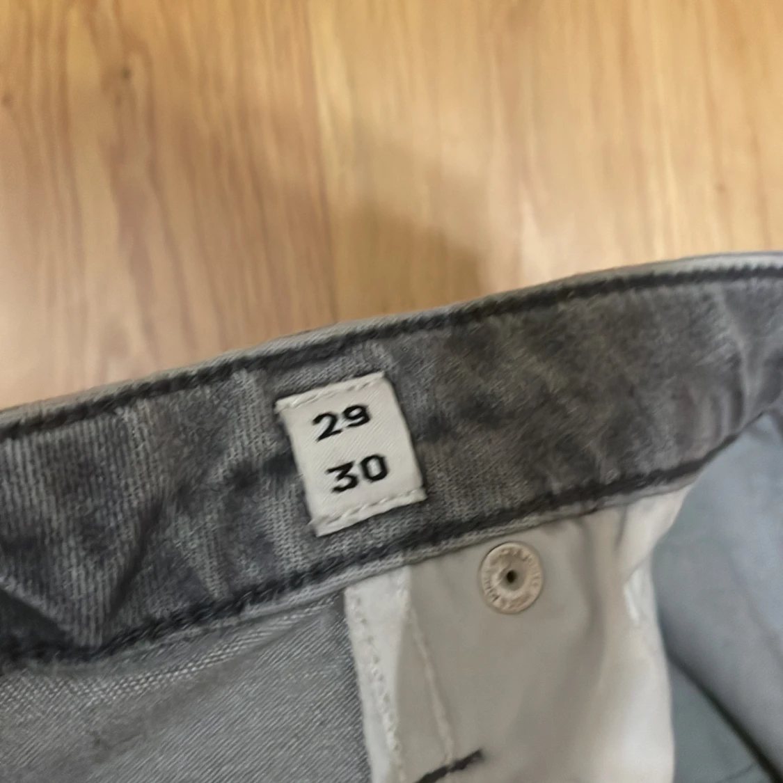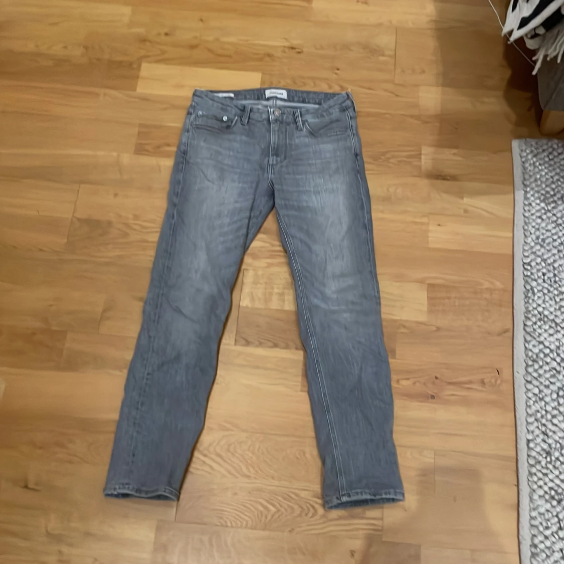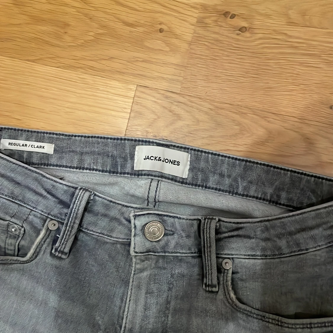 Säljer ett par grå jeans från Jack & Jones i modellen Regular Clark. De har en klassisk femficksdesign med knapp och dragkedja framtill. Perfekta för en avslappnad stil.