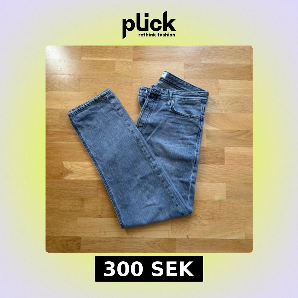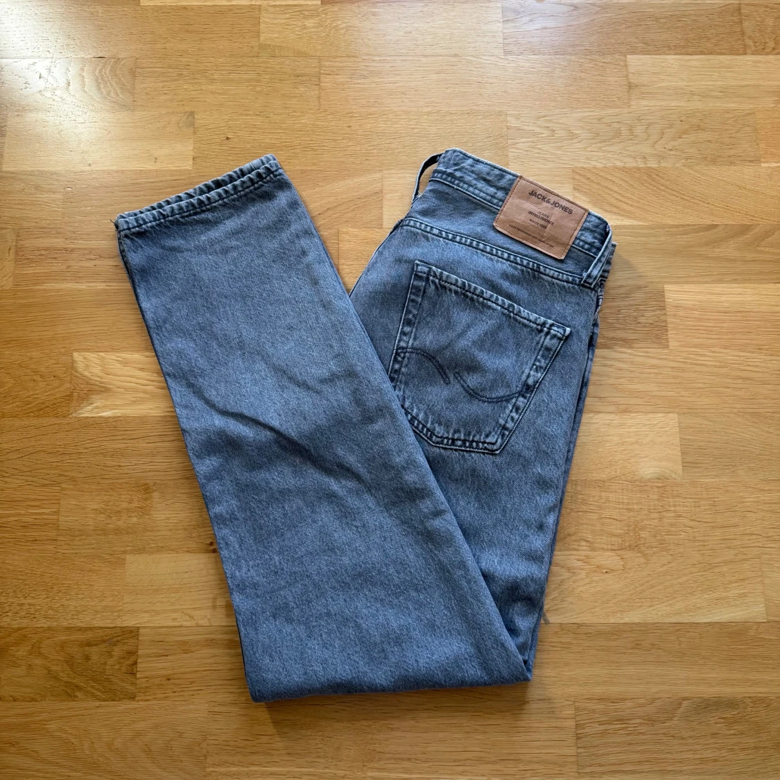 Säljer ett par grå raka jeans från Jack & Jones, modell Loose/Chris. Jeansen har klassisk femficksdesign, rak passform och är tillverkade i slitstarkt denimtyg. Perfekta för dig som gillar en avslappnad och trendig look.