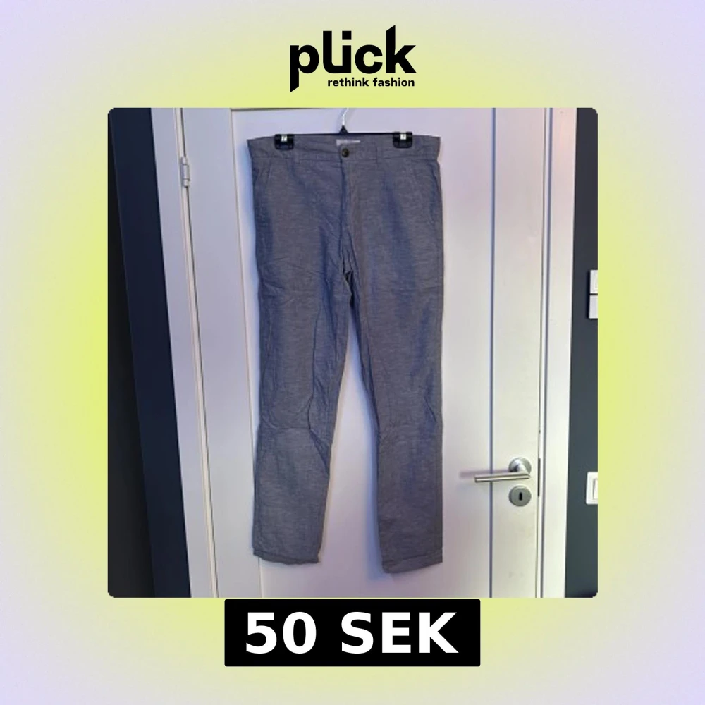 Snygga blå byxor från Jack & Jones i tapered modell. Byxorna har klassisk passform med raka ben, bälteshällor och knäppning fram. Tillverkade i ett lätt och svalt material som passar perfekt till varmare dagar. Fickor både fram och bak med knappar bak. I mycket bra skick men lite skrynkliga.