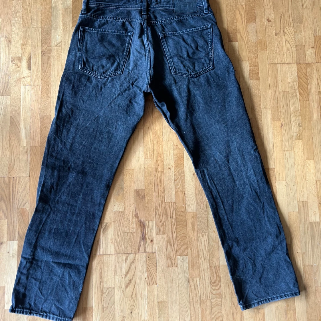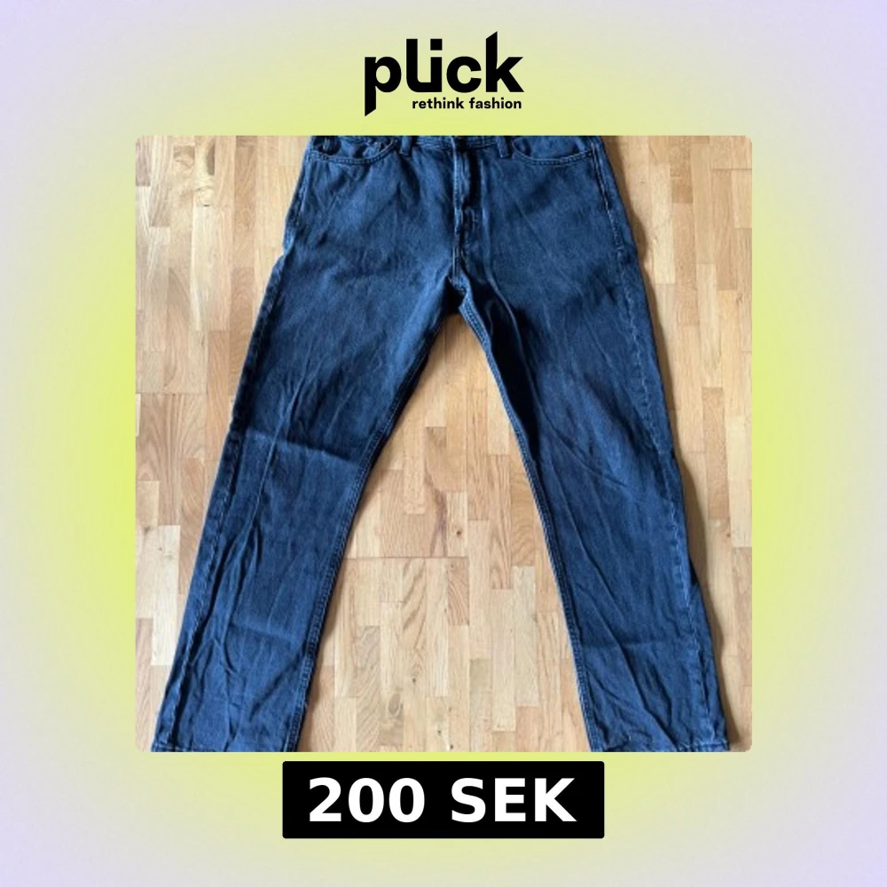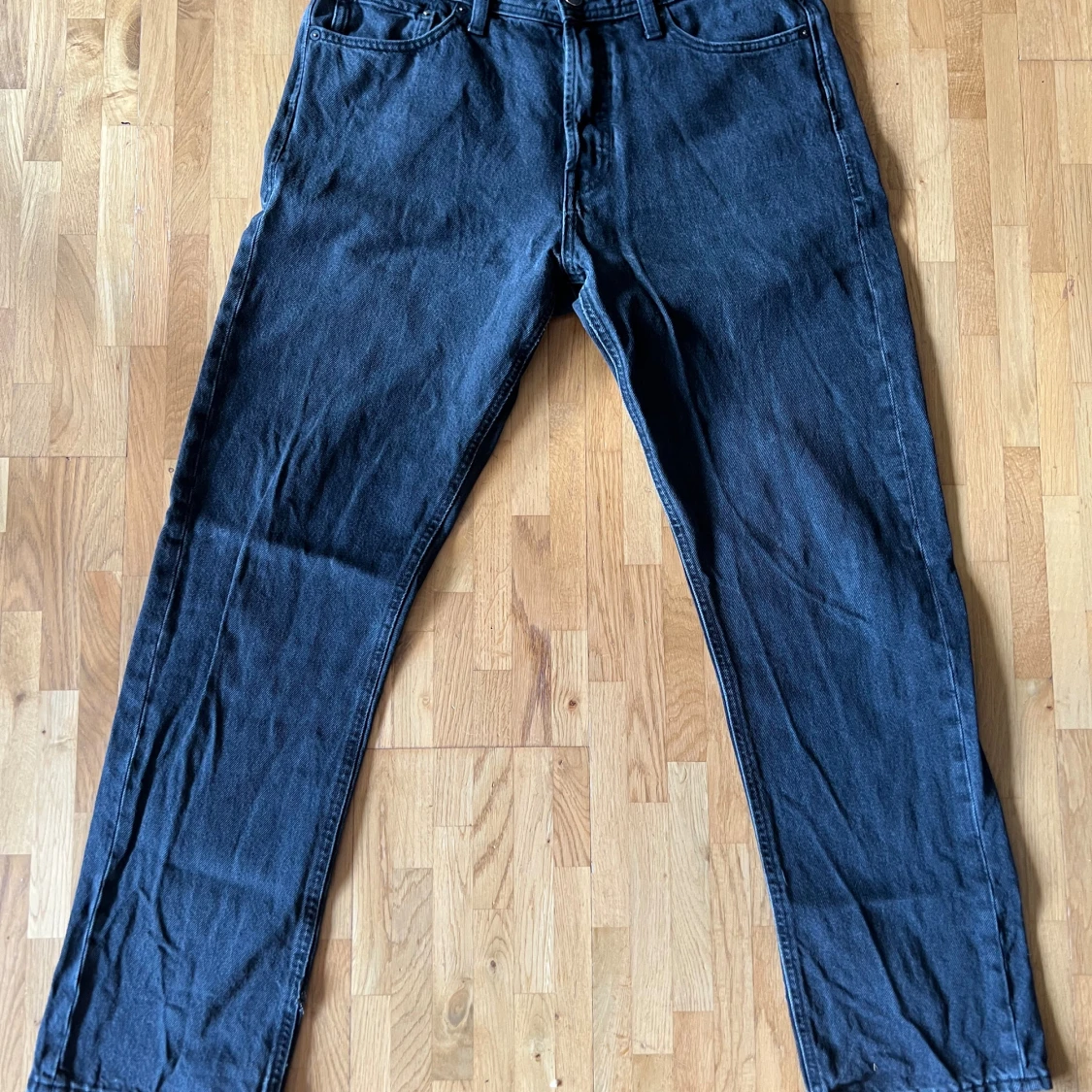 Säljer ett par svarta jeansbyxor i klassisk rak modell. Jeansen har fem fickor, bälteshällor och är tillverkade i ett slitstarkt denimtyg. Perfekta för dig som gillar en enkel och tidlös look.