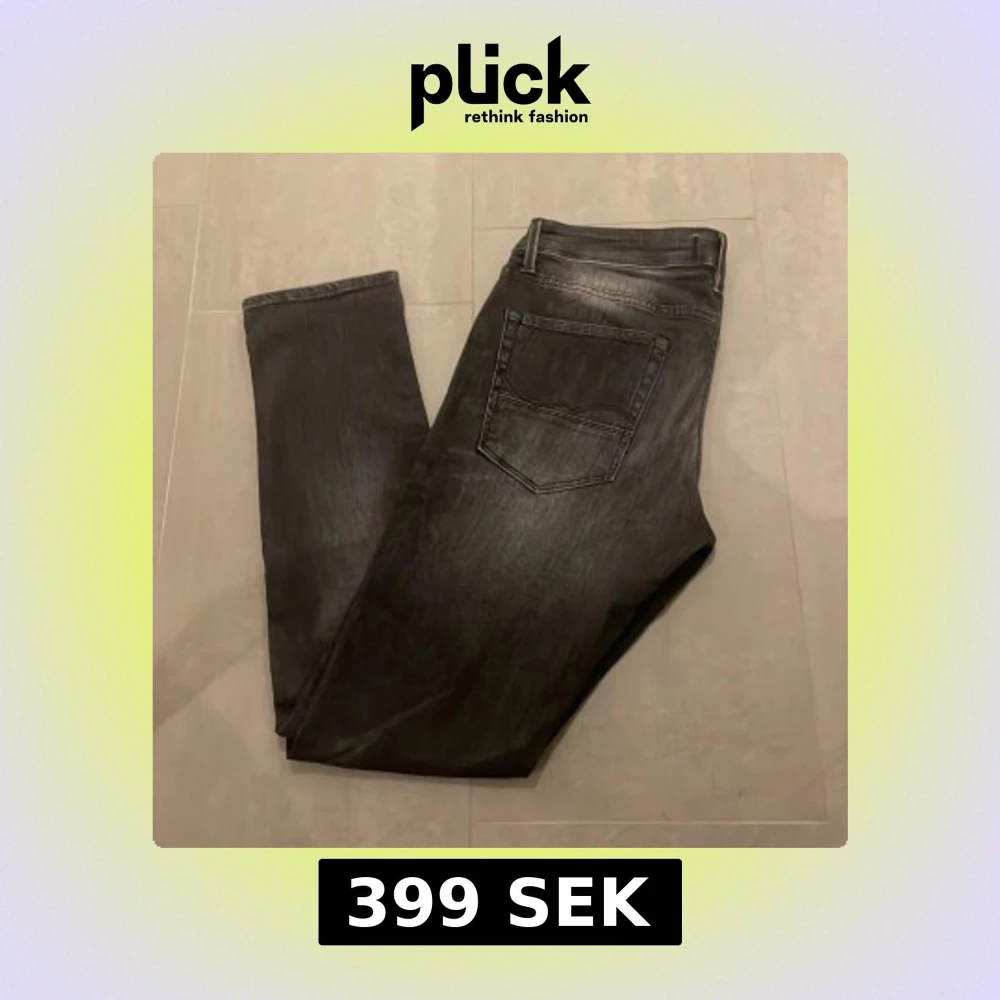 Säljer ett par svarta jeans från Slim/Glenn med snygg tvättad look. Jeansen har klassisk femficksdesign, smal passform och normal midja. Materialet är jeans och färgen är mörksvart med lätt slitningseffekt. Perfekta för dig som gillar en stilren och modern vibe. Jack and Jones!