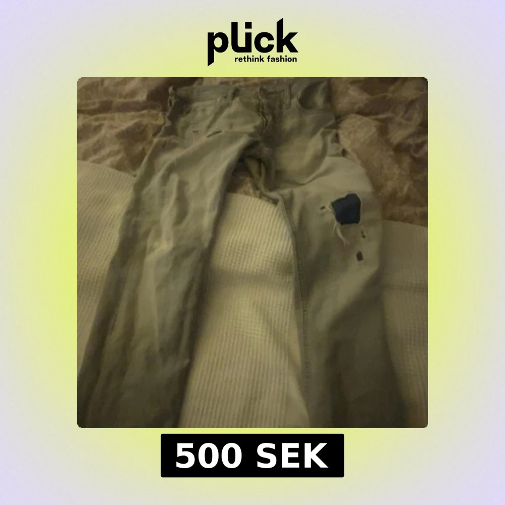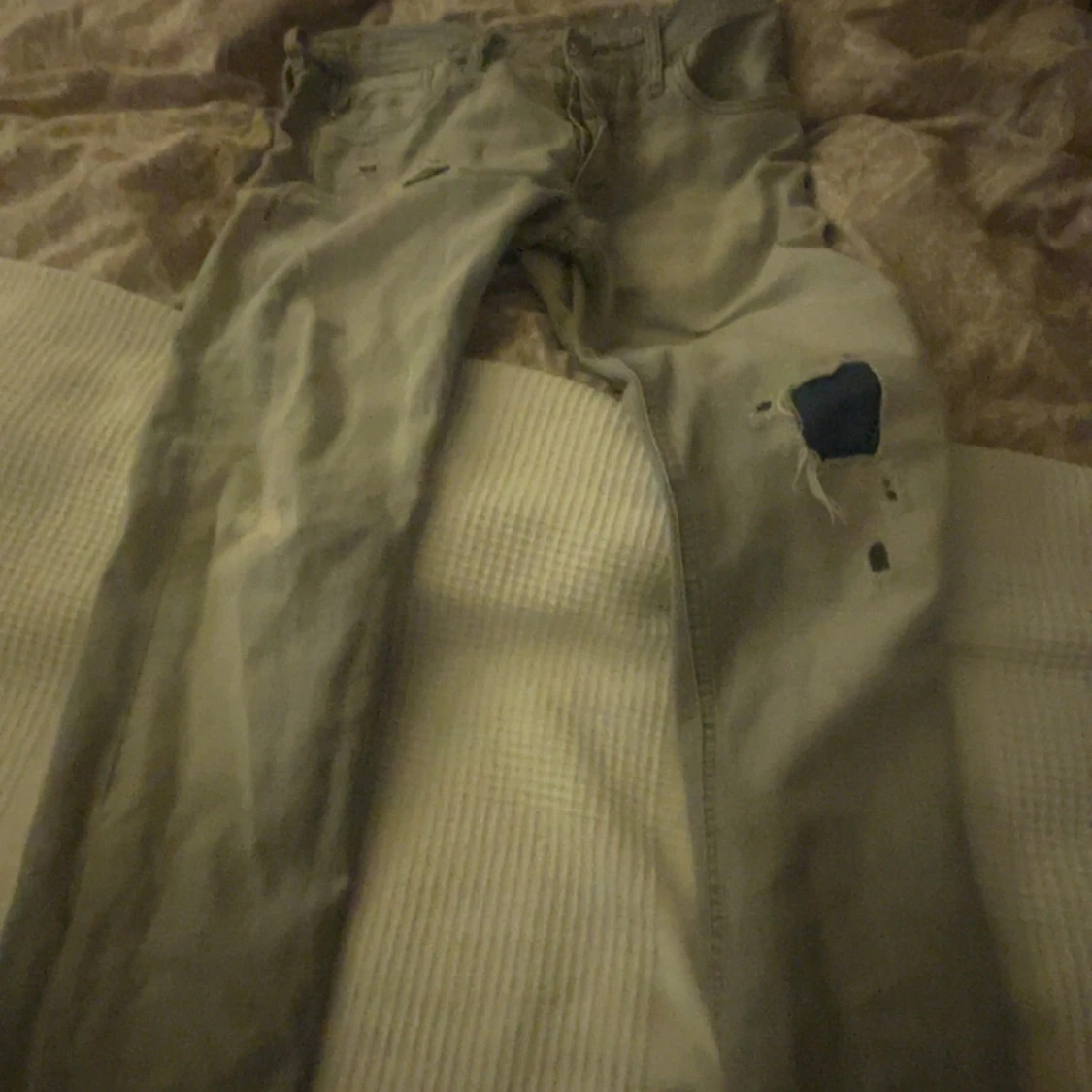Säljer ett par gröna jeans med coola slitningar och en lappad detalj på ena benet. Perfekta för en avslappnad stil. De har en klassisk femficksdesign och knappgylf.