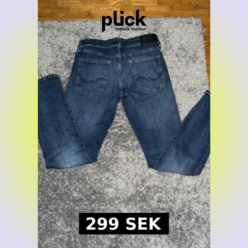 Snygga blå Jack&jones jeans. Jeansen har en mörkblå tvätt med lätt slitning och detaljer i kopparfärg. Perfekt passform med normal midja och smalare ben, passar till allt.