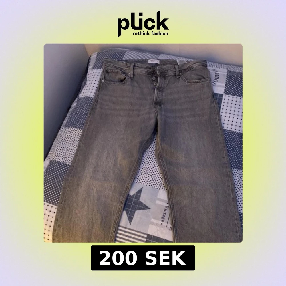 Snygga grå Jack Jones jeansbyxor med klassisk femficksdesign och knappgylf. Perfekta för en avslappnad stil. De har en rak passform och är tillverkade i slitstarkt denim. I nyskick