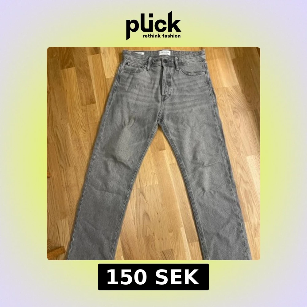 Säljer ett par grå jeans från Jack & Jones med klassisk femficksdesign och raka ben. Jeansen har lös passform och är tillverkade i bomull. Perfekta för dig som gillar en enkel och stilren look.