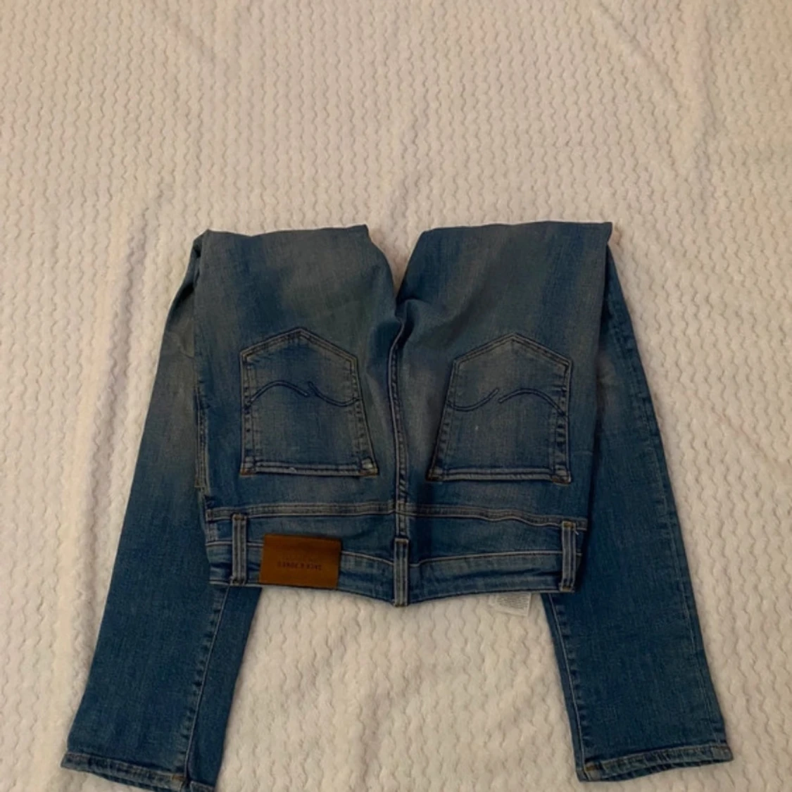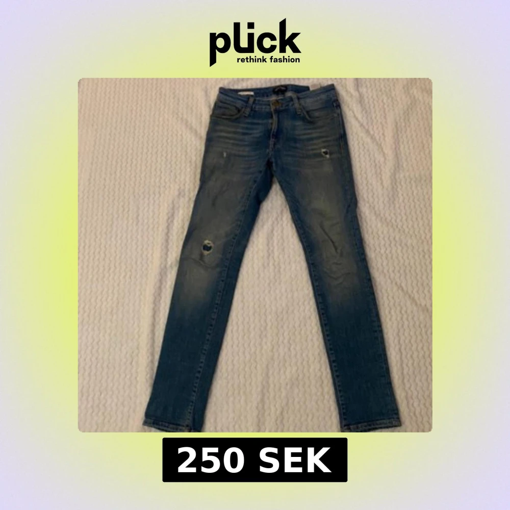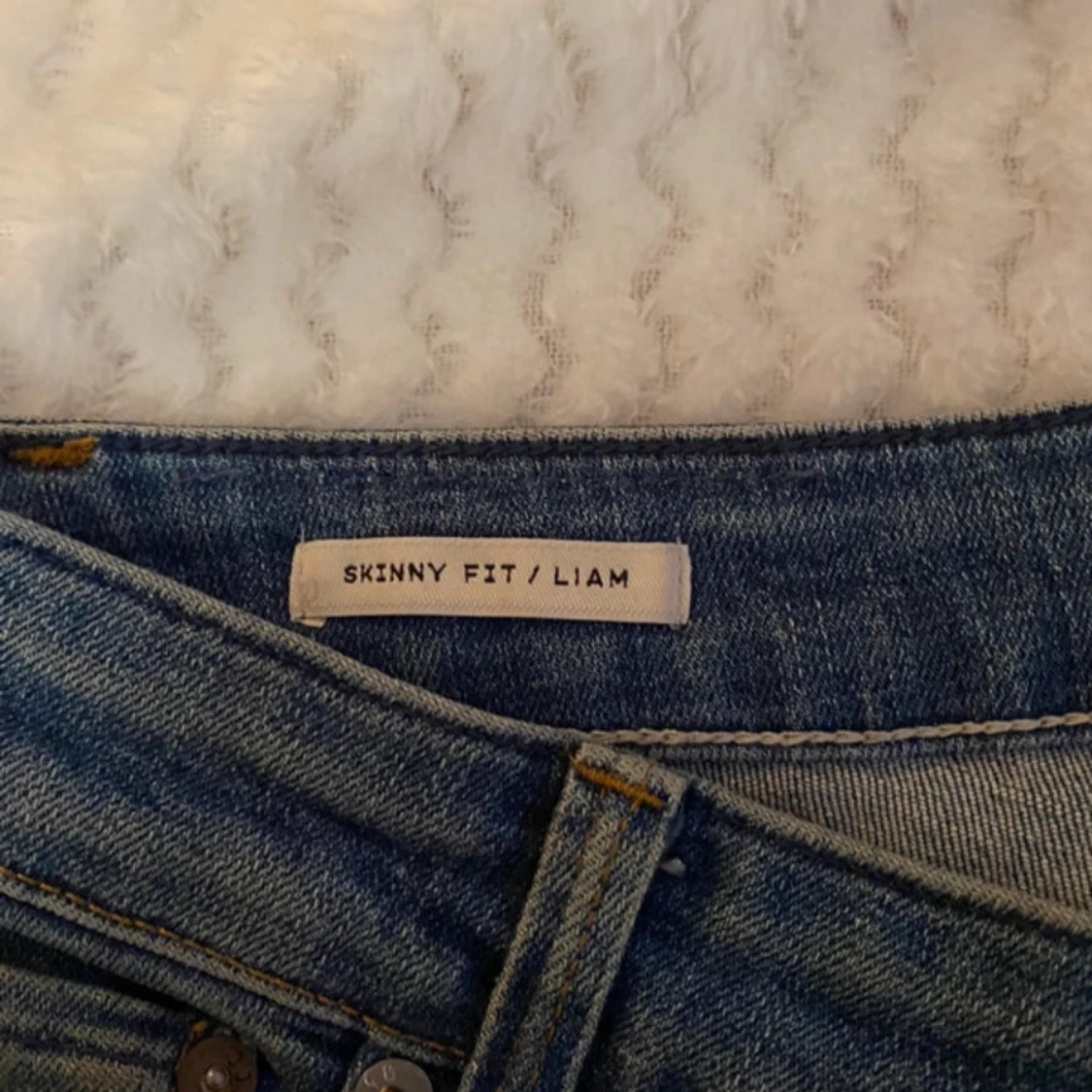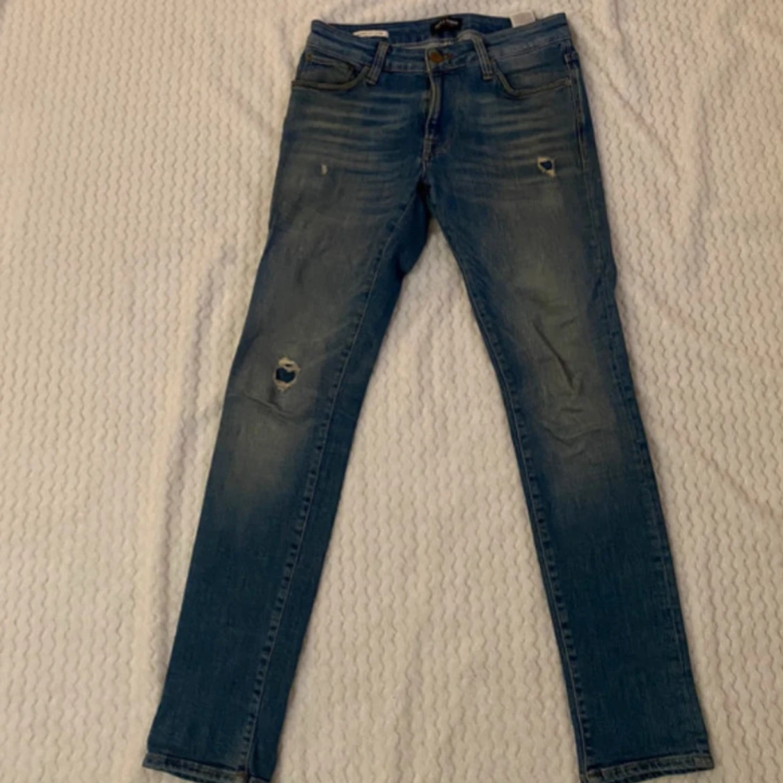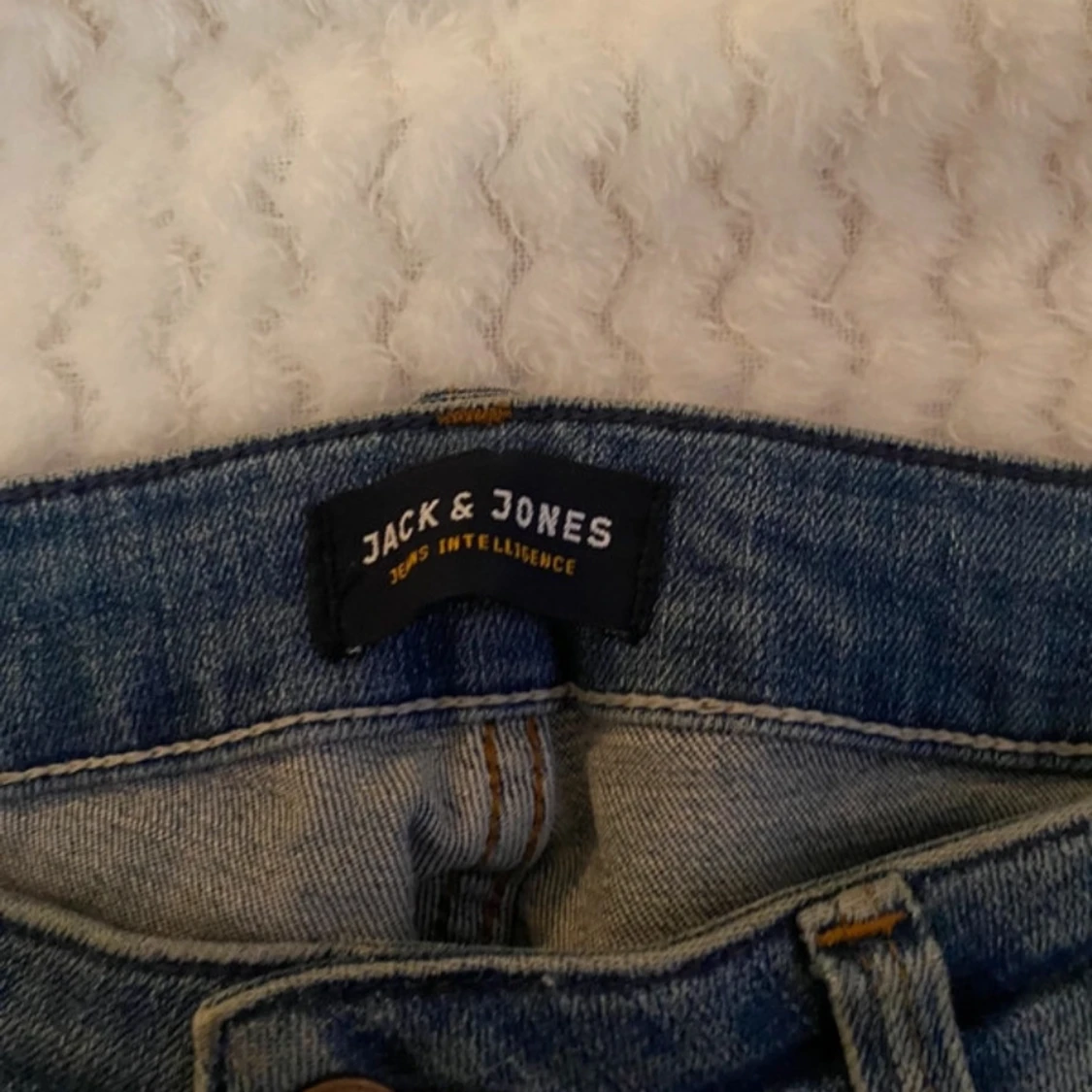 Säljer ett par blå skinny jeans från Jack & Jones, modell Liam. De har en klassisk femficksdesign och slitna detaljer på framsidan för en trendig look. Perfekta för en stilren vardagsoutfit.