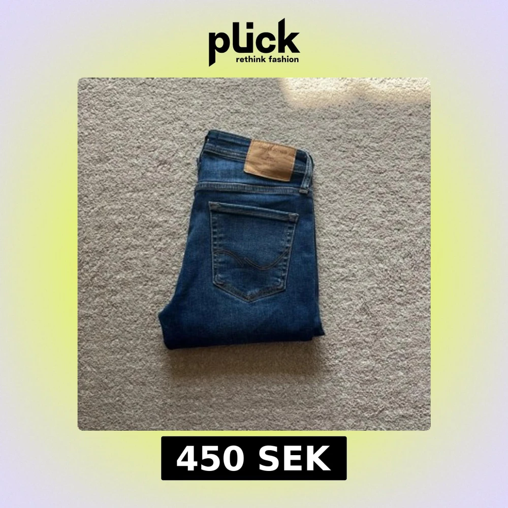 Snygga blå jeans från Jack & Jones med klassisk femficksdesign och läderpatch bak i midjan. Jeansen har en slim passform och är tillverkade i stretchig bomullsdenim för extra komfort. Storlek 31/30. Pris kan diskuteras vid snabbaffär🤝