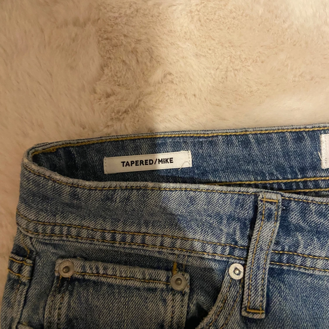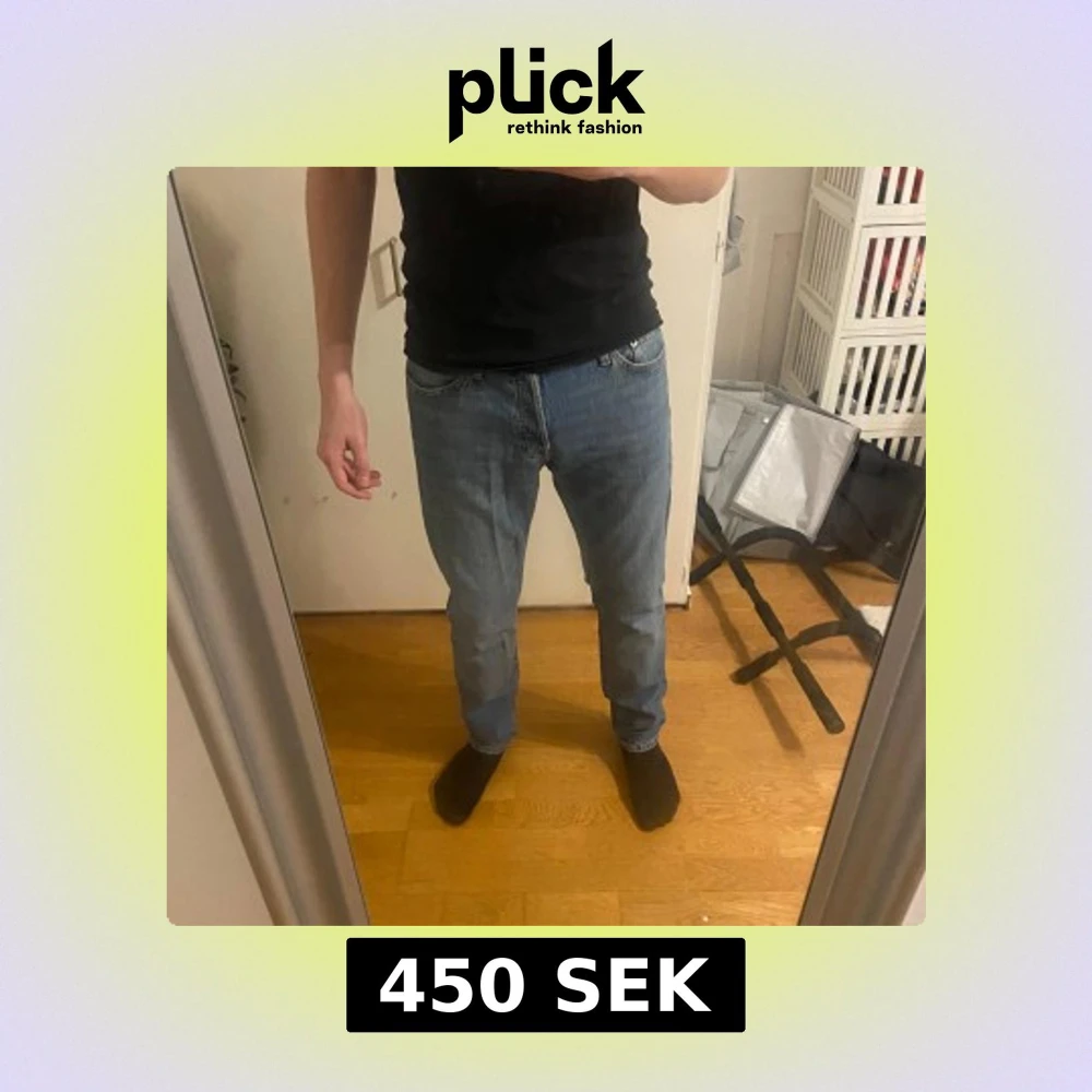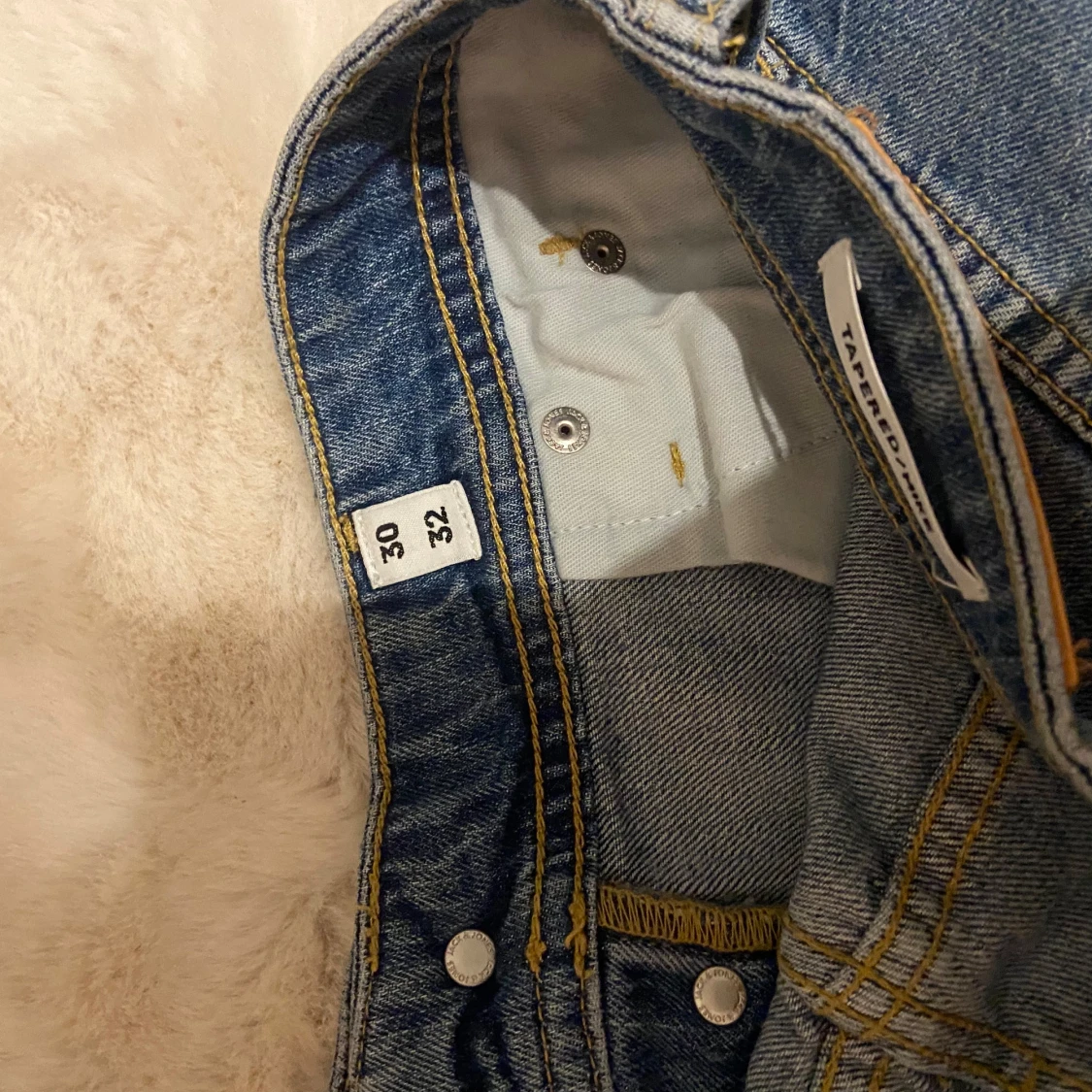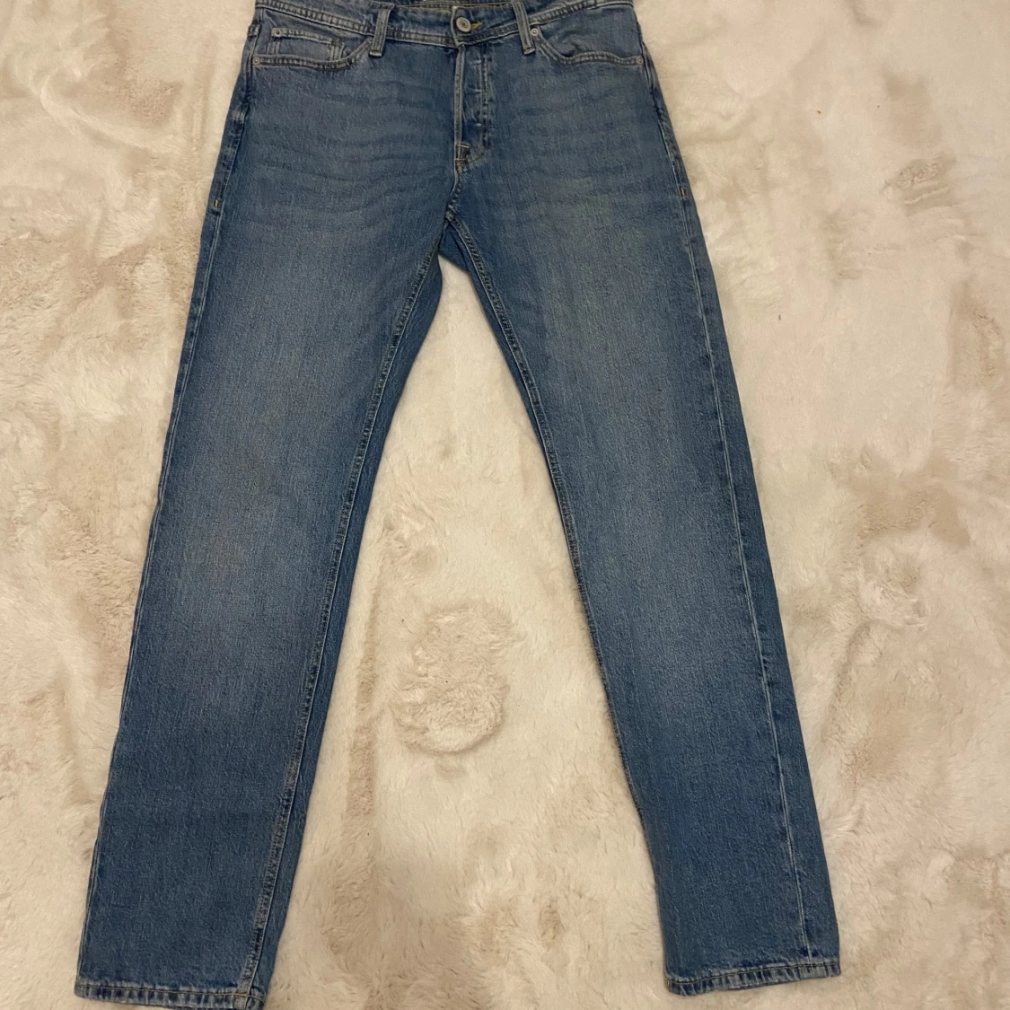 Säljer ett par snygga blå jeans med tapered passform. De har en klassisk design med fem fickor och knappar i midjan. Använda en gång då jag köpte fel storlek.