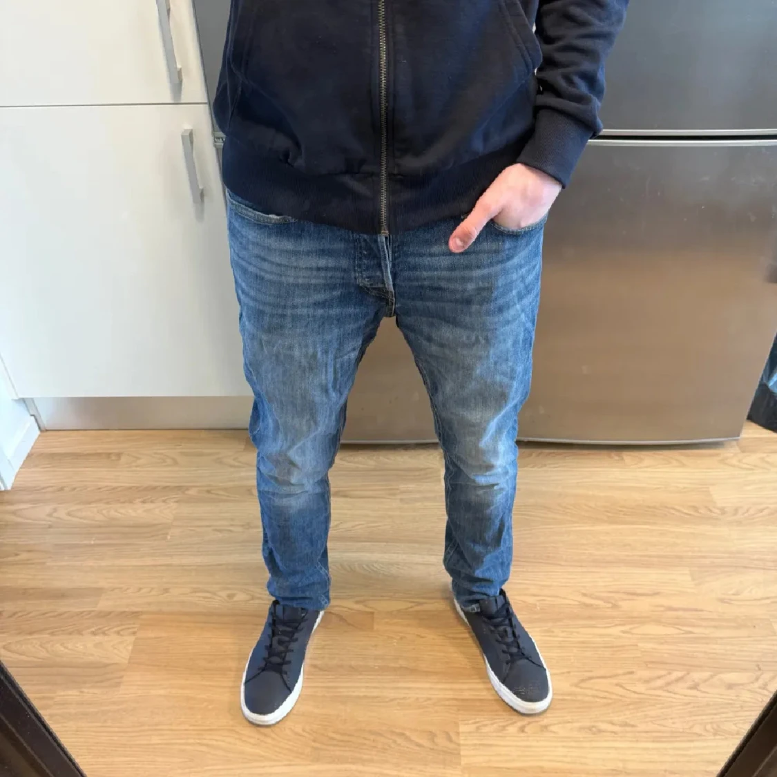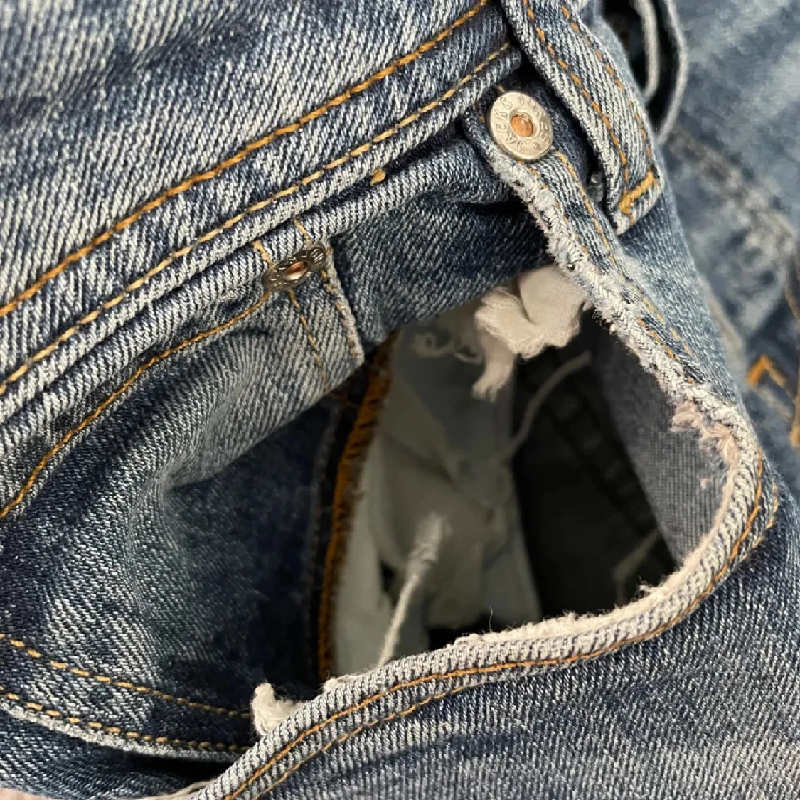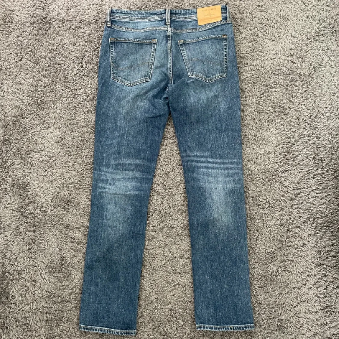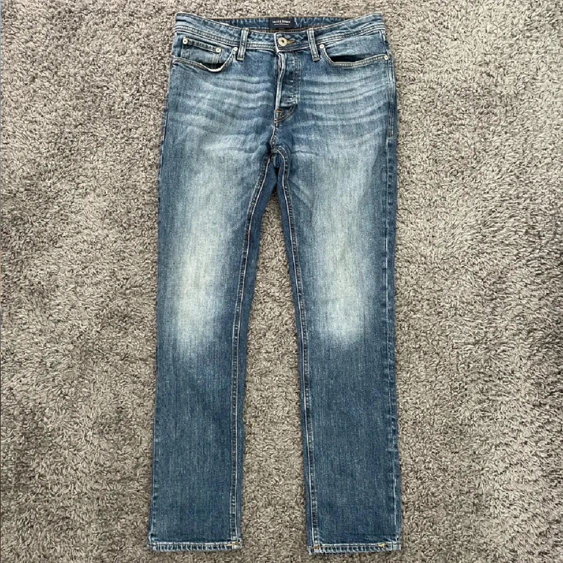 Sjukt snygga blåa Jack & Jones Comfort/Mike jeans i fint skick (Hål i högra fickan, se bild 3) & lite missformad på baksidan därav priset. Storlek: W31/L32. Mått - Midja: 41cm Benlängd: 103cm. Hör av dig vid funderingar!🤩