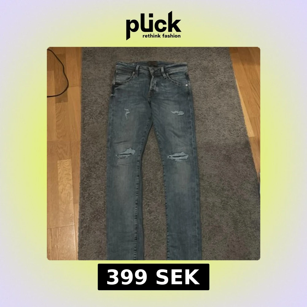 Säljer ett par blå slim fit jeans från Jack & Jones, modell SLIM/GLENN. Jeansen har slitna detaljer på benen för en trendig look. Klassisk femficksmodell med normal midja och smal passform. Perfekta till sneakers och hoodie. Storlek 29/32 men är små i storleken så skulle typ säga 27/28 i midja. Pristet inte hugget i sten så kom med prisförslag