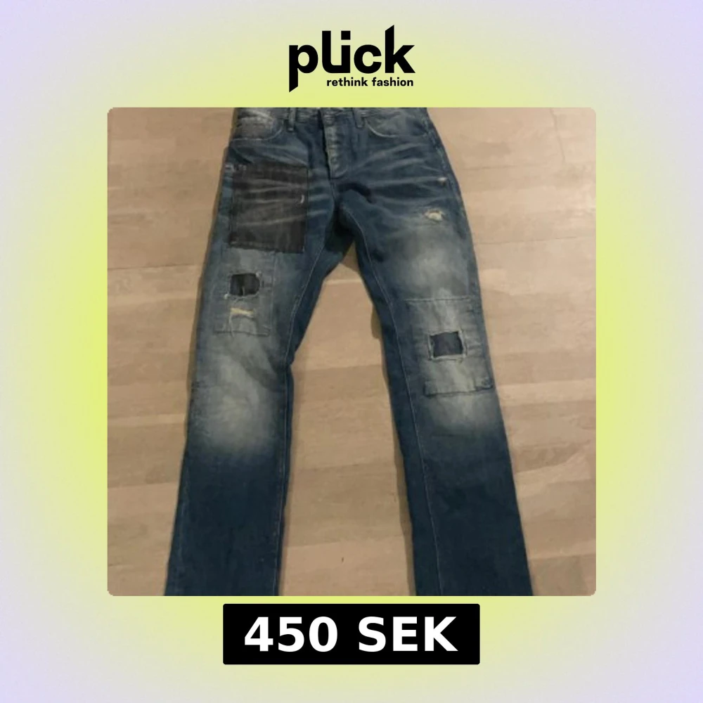 Säljer ett par blå jeans från Jack & Jones med coola patchade detaljer och slitningar på benen. Jeansen har raka ben, klassisk femficksdesign och tydliga kontrastsömmar. Materialet är jeans i bomull och de har en normal passform.
