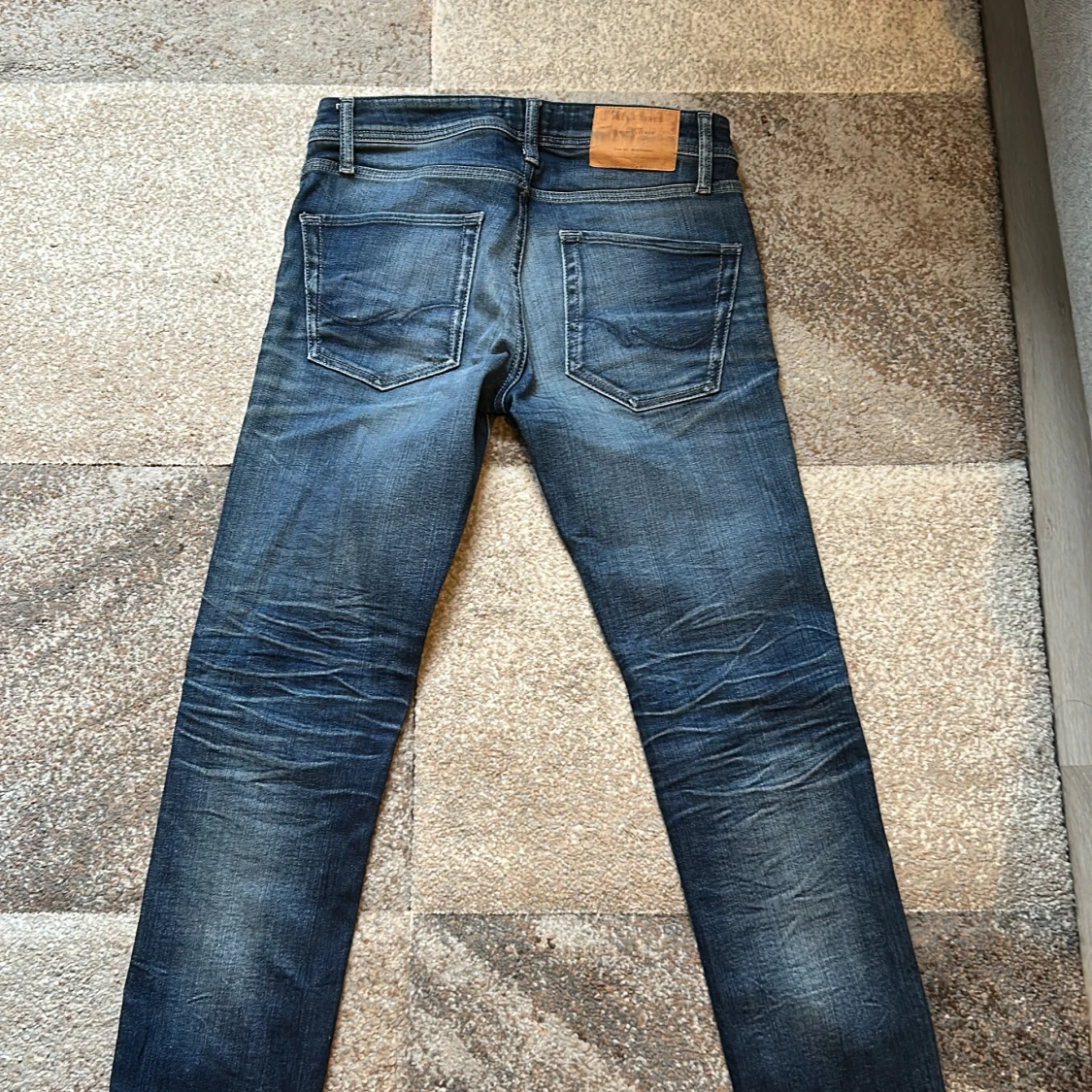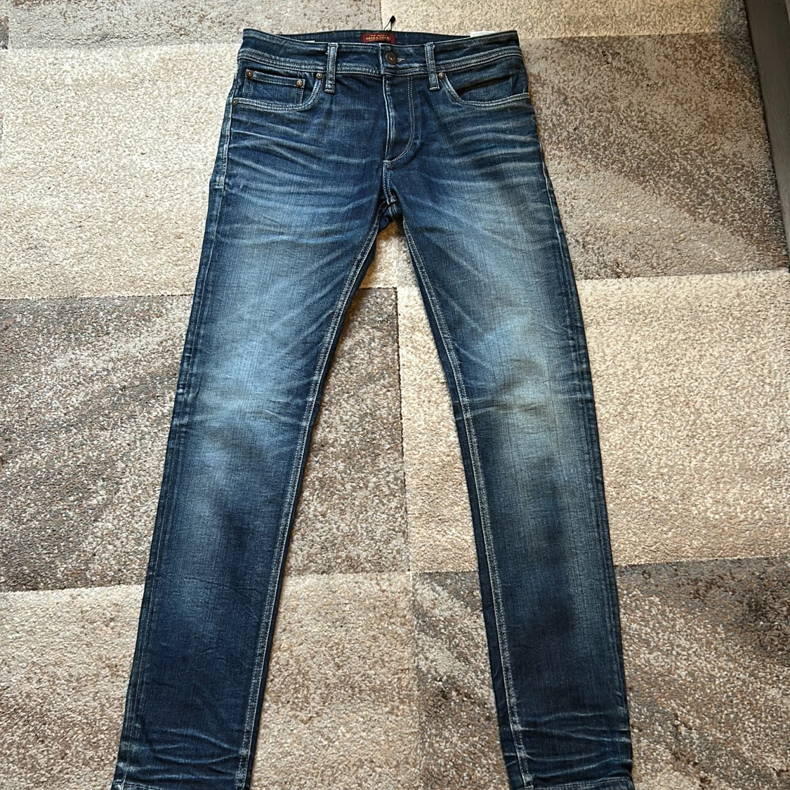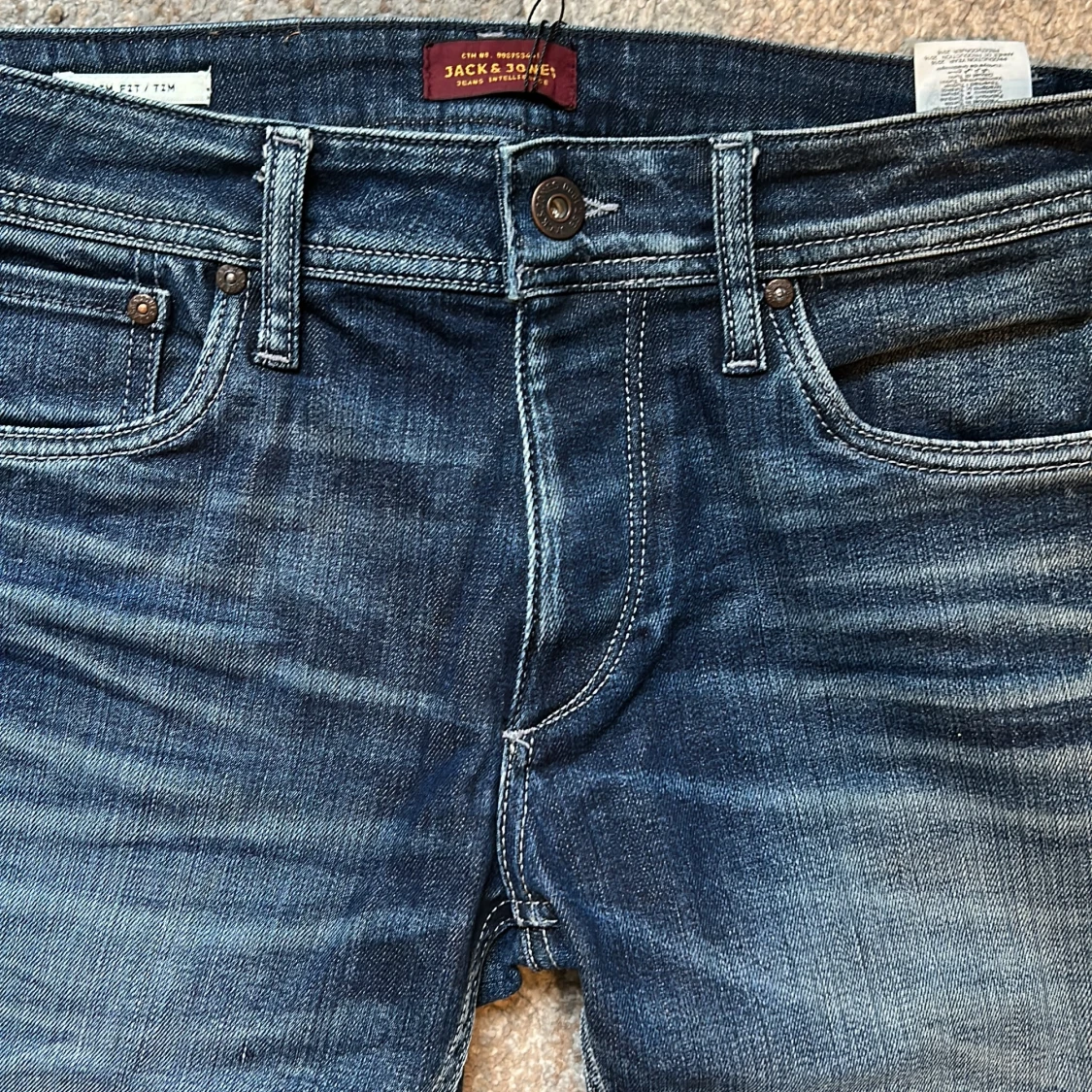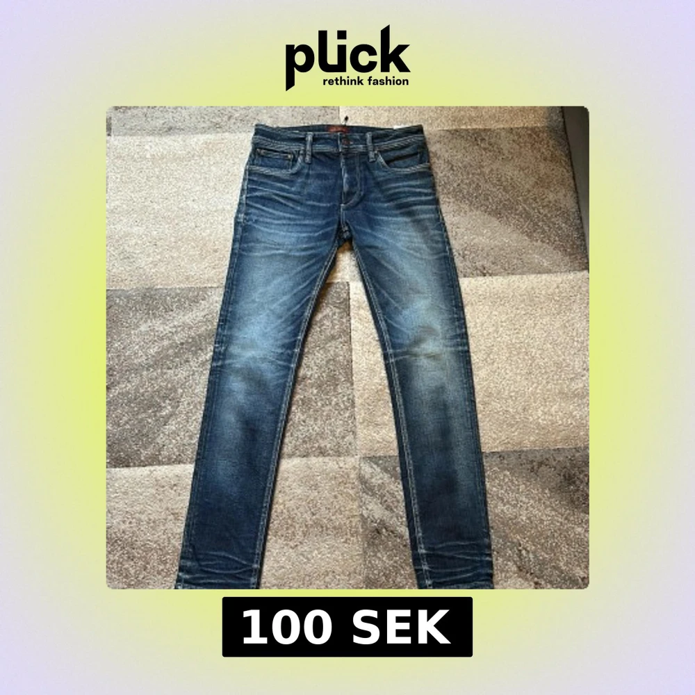 Slim fit jeans från Jack & Jones i modellen Tim. Klassisk femficksdesign i mellanblå tvätt med snygga slitningar och kontrastsömmar. Jeansen har normal midja och smal passform hela vägen ner. Perfekta för dig som gillar en clean och modern look. Innerbens 78 midjemått 80cm