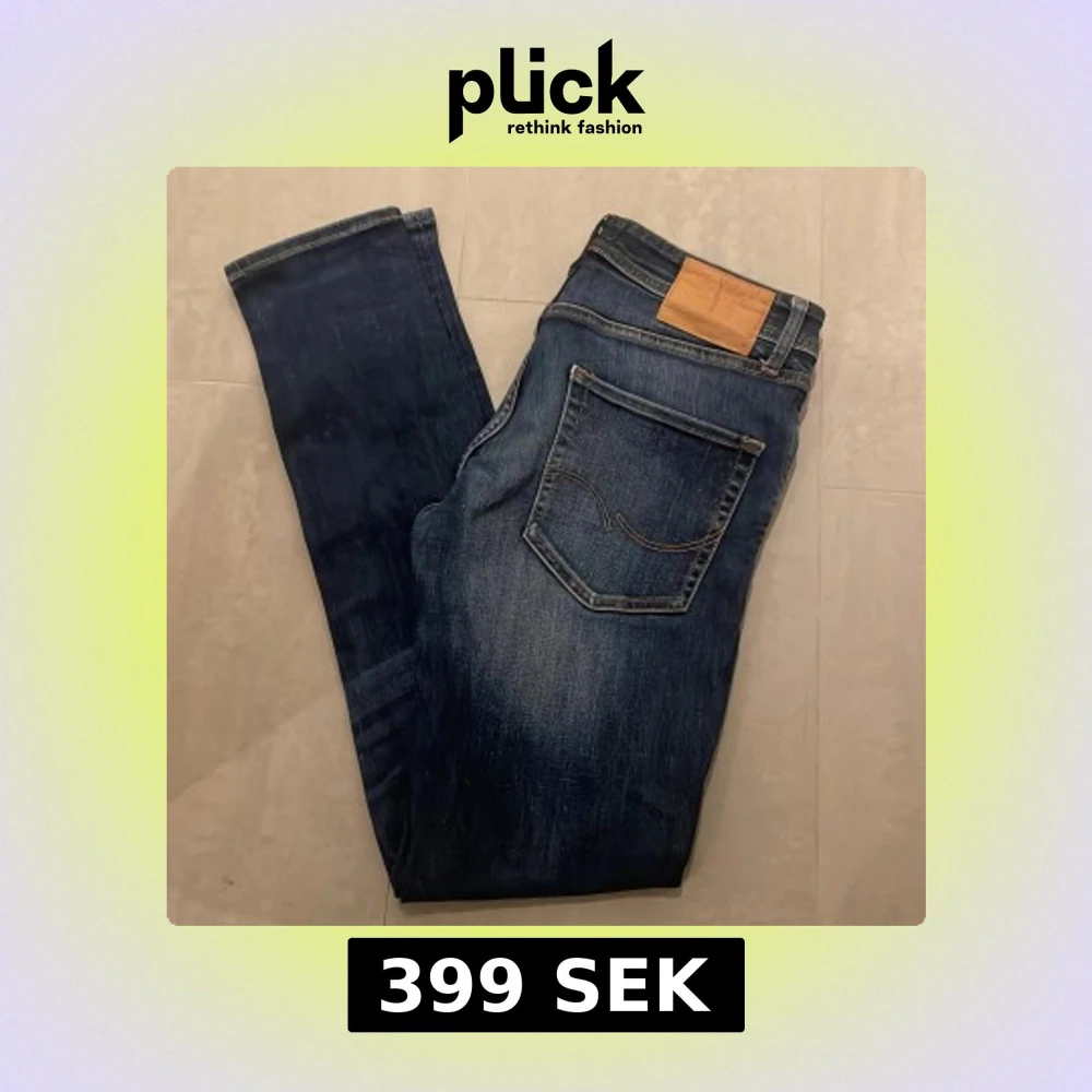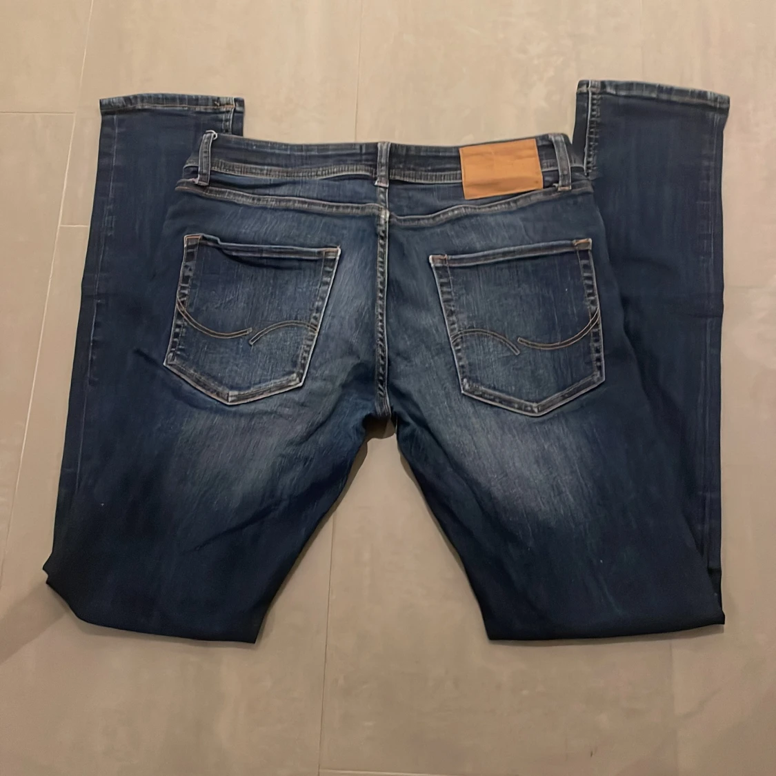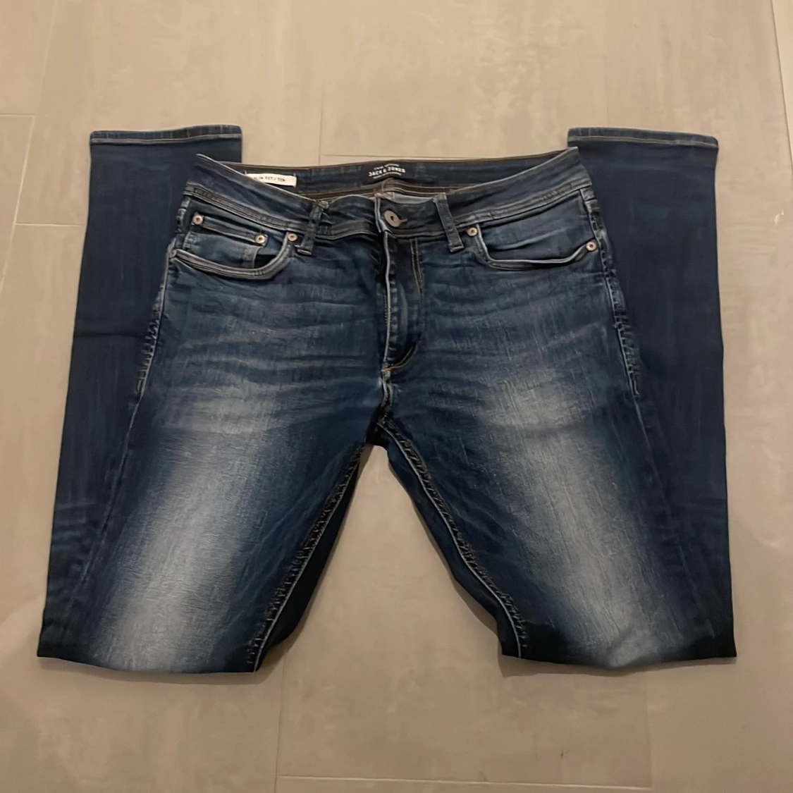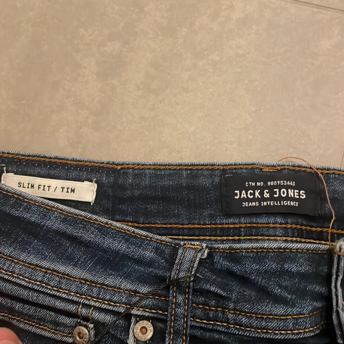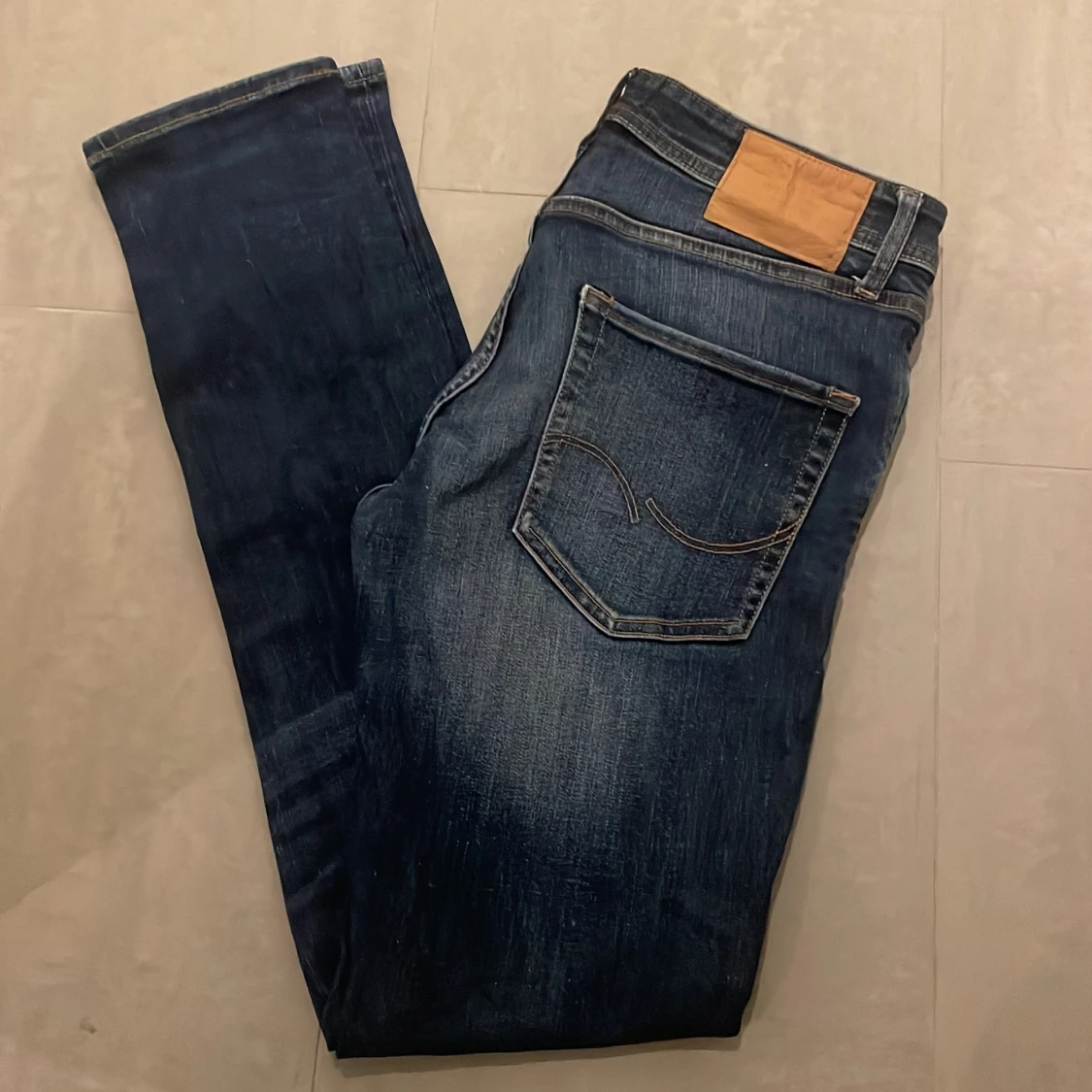 Mörkblå jeans från Jack & Jones i modellen Slim Fit Tim. Jeansen har snygga slitningar och kontrastsömmar, klassisk femficksdesign och läderpatch bak i midjan. Tillverkade i stretchig denim för en bekväm passform.