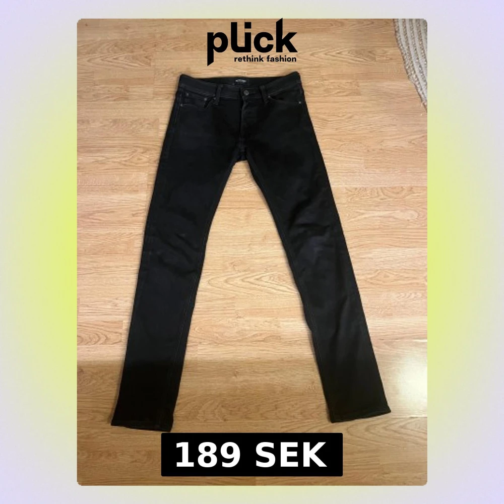 Svarta jeans från Jack & Jones i modellen slim/glenn med fem fickor och klassisk knappstängning. Perfekt för dig som gillar en stilren look med svart denim. Strl 30/34