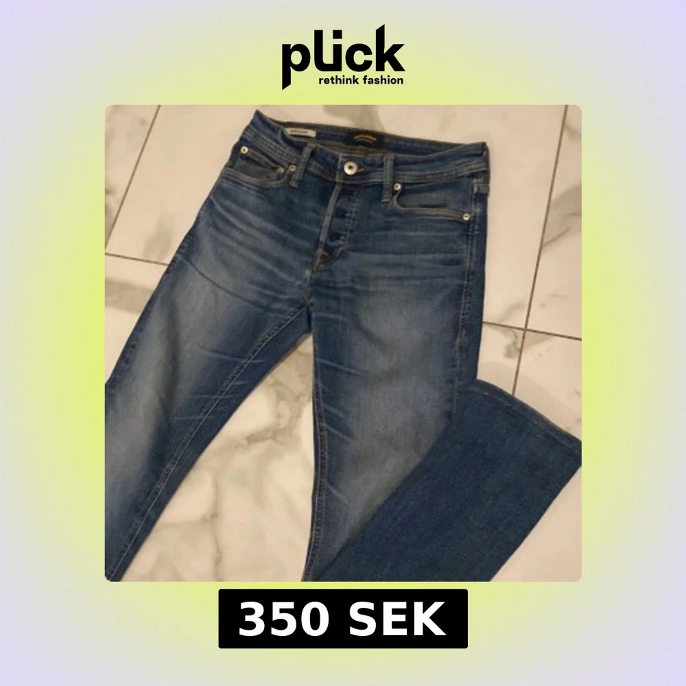Säljer ett par klassiska blå jeans från Jack & Jones med snygg tvätt och smal passform. Jeansen har fem fickor, gylf med dragkedja och läderpatch bak i midjan. Perfekta för dig som gillar en stilren och enkel look.