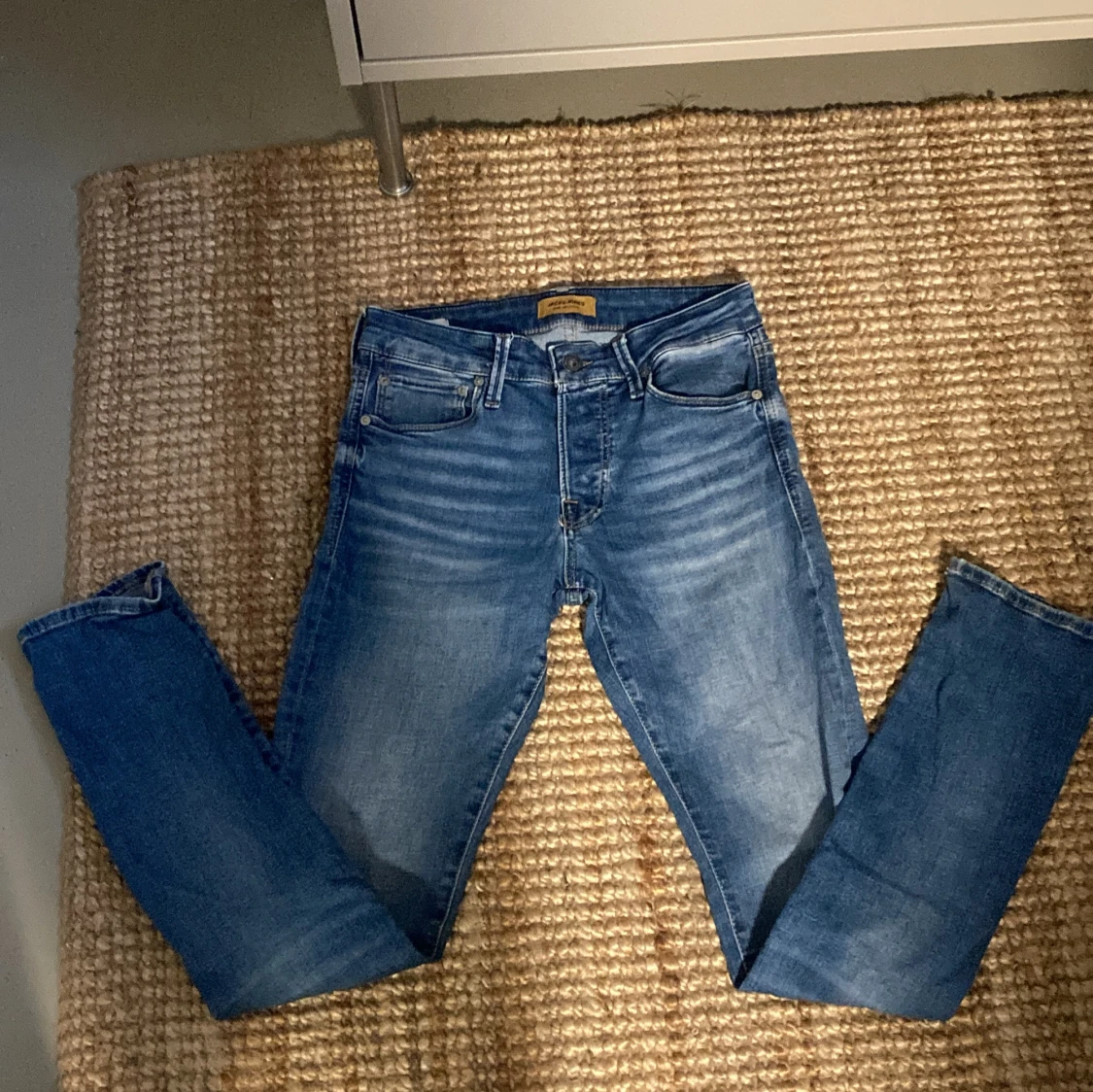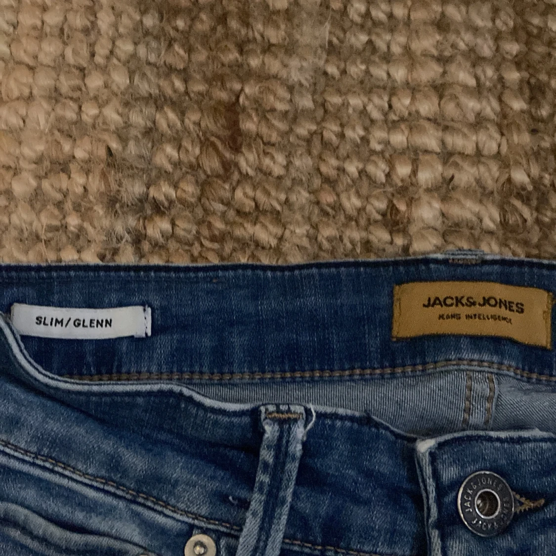 Snygga blå jeans från Jack & Jones, modell Slim/Glenn. Jeansen har klassisk femficksdesign, normalhög midja och smal passform. Tillverkade i mjukt denimtyg med lätt slitningar och snygg tvätt. Perfekta för en avslappnad och trendig look.