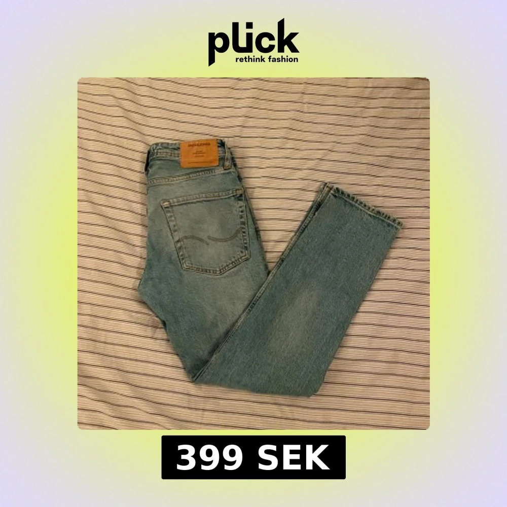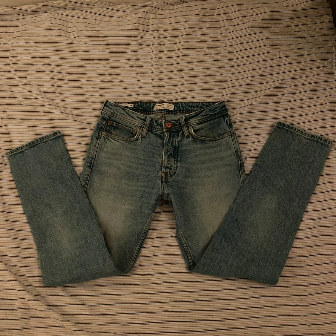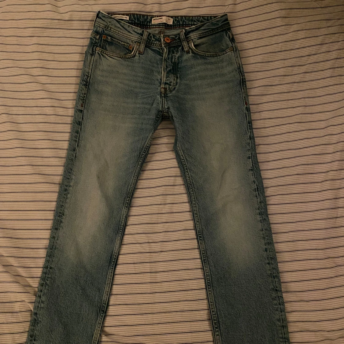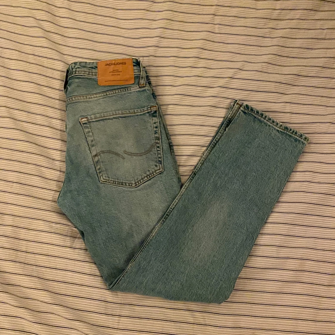 Säljer ett par ljusblå jeans från Jack & Jones med klassisk femficksdesign och snyggt slitna detaljer. Jeansen har normal passform och raka ben, tillverkade i mjukt bomullsjeansmaterial. Perfekta för en avslappnad och stilren look. 27/30