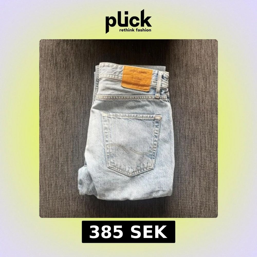 STORLEK W29 L32 Säljer ett par klassiska ljusblå jeans från Jack & Jones med raka ben och normal passform. Riktigt goa jeans som är perfekta för sommarn. Passar bra med vit tisha eller ljus tröja. Jeansen har fem fickor, bälteshällor och snygga kontrastsömmar. Tillverkade i bomull med en vintage tvättad look och läderpatch bak i midjan.