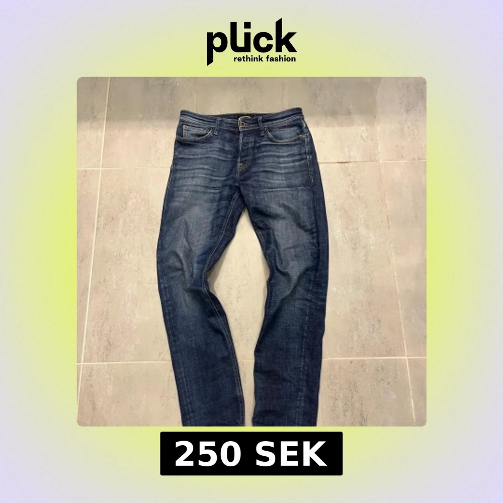 Snygga blå jeans från Jack & Jones med klassisk femficksdesign och bruna detaljer på bakfickan. Använda men inga slitningar eller fläckar. W29 L32 modell tapered/mike