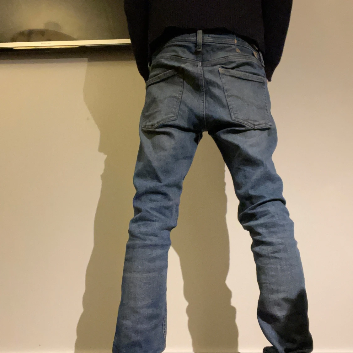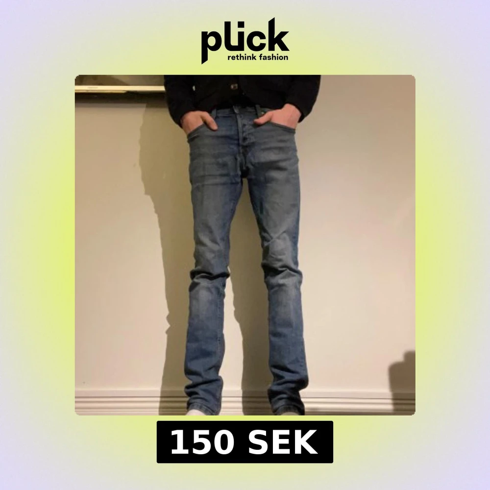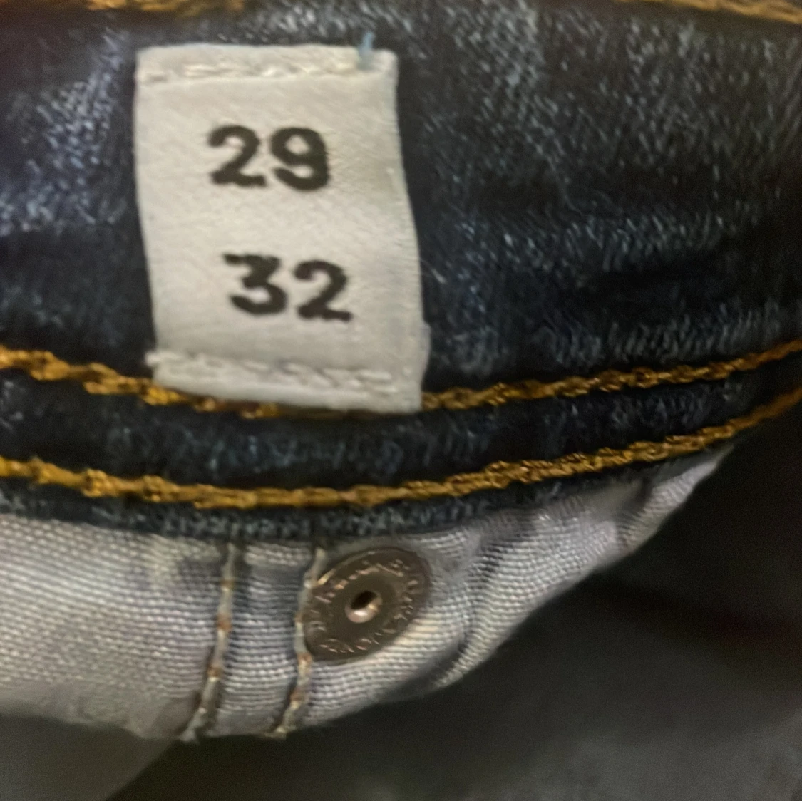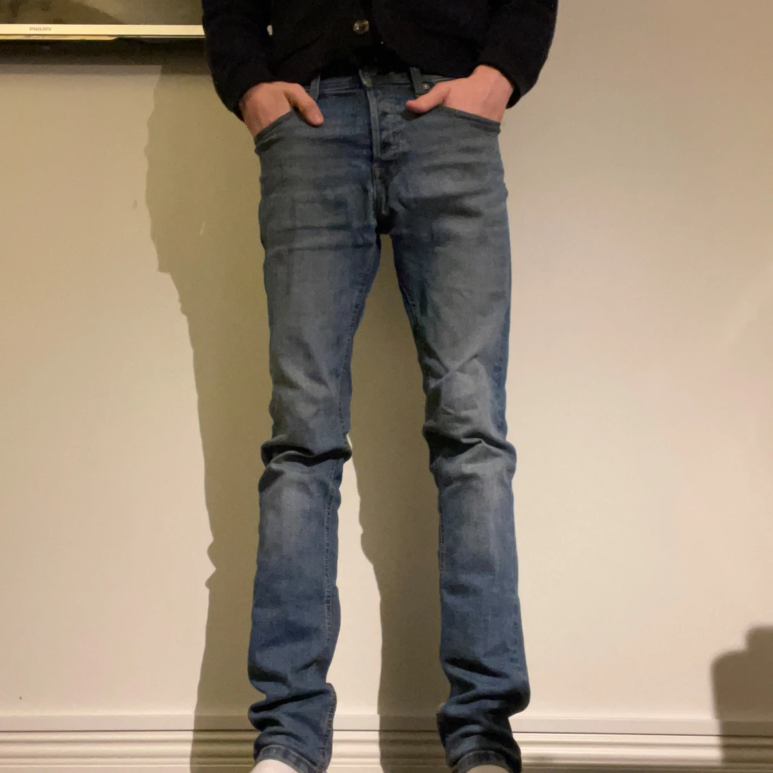 Snygga blå slim straight jeans från Jack & Jones med klassisk design. De har en bekväm passform och är perfekta för en stilren look. Midjan är w29 och längden är 32, vilket ger en bra passform för många. De är lite slitna men funkar. 6/10