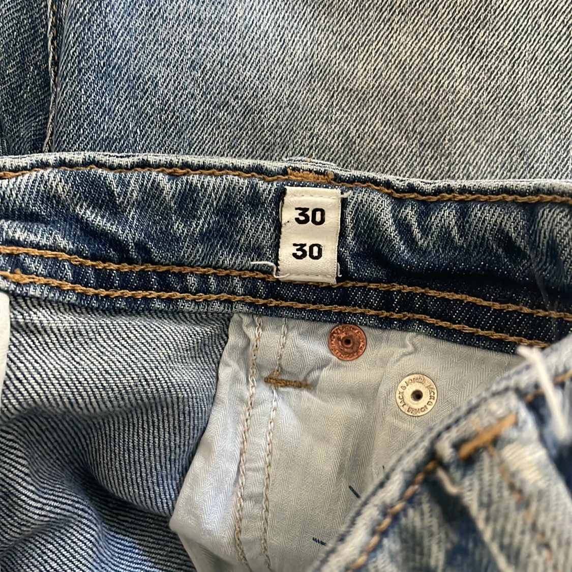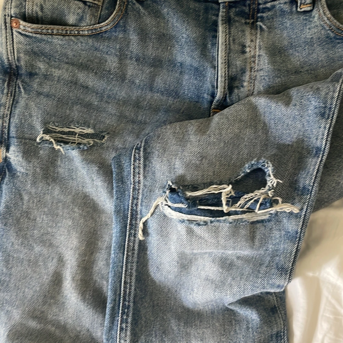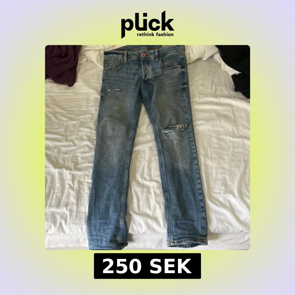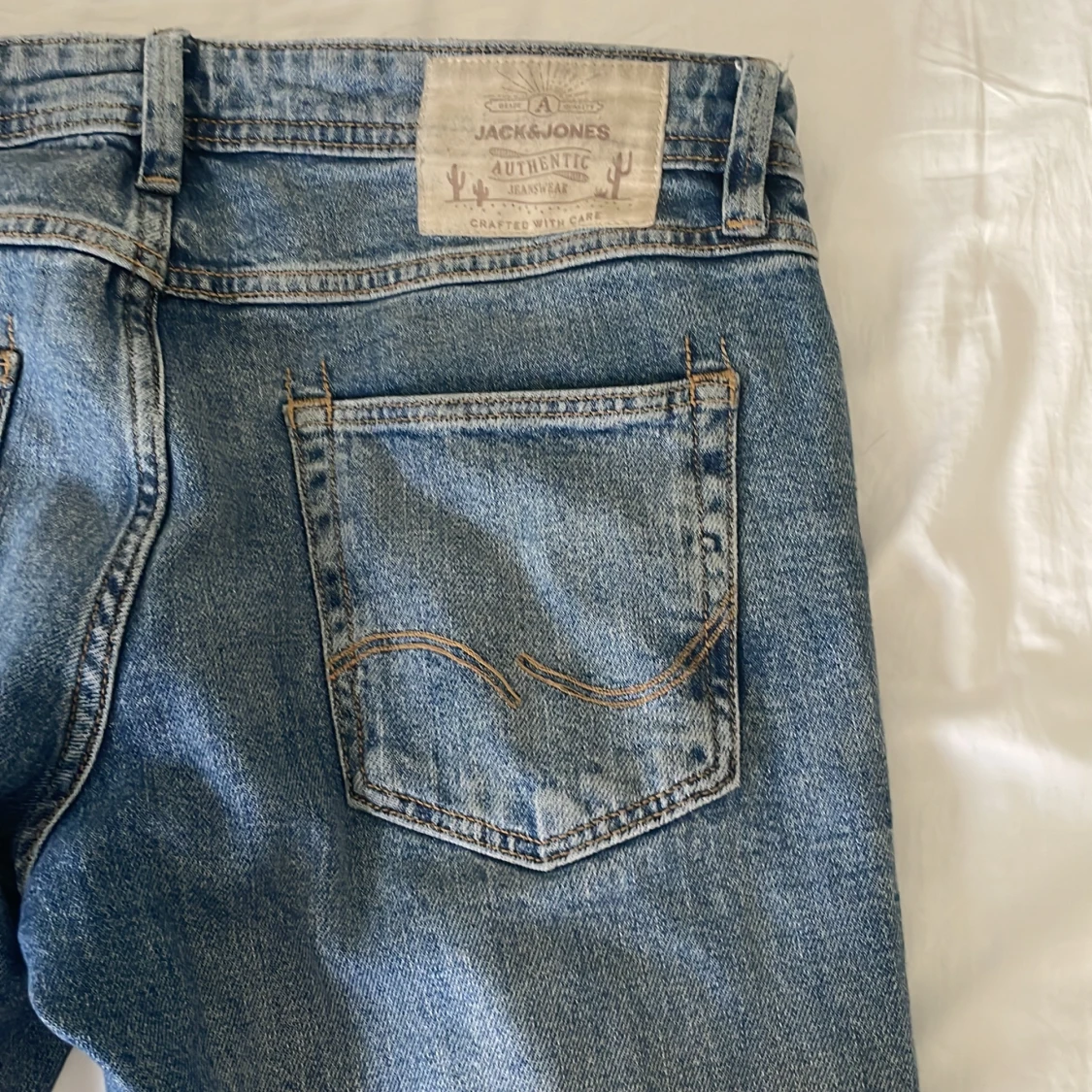 Säljer ett par blå jeans från Jack & Jones med slitna detaljer och hål på ena benet. Klassisk femficksmodell med raka ben och slim passform. Perfekta för en avslappnad stil.